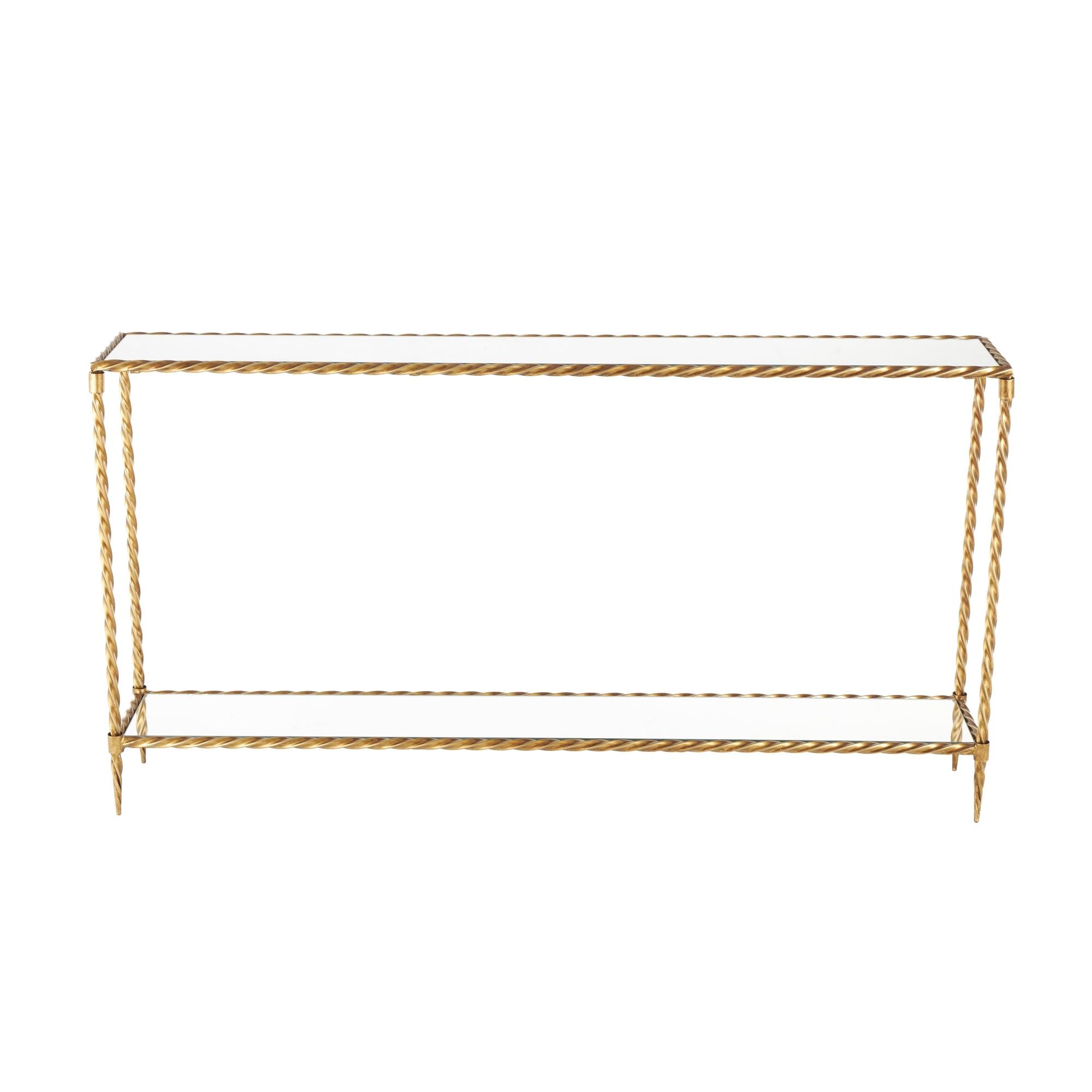 Gold Metal Twisted Rope Inspired Living Room Console Table with Mirrored Glass Top and Shelf