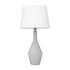 •A modern table lamp featuring a drum-shaped fabric shade mounted on a metal accent and bottle-shaped ceramic body