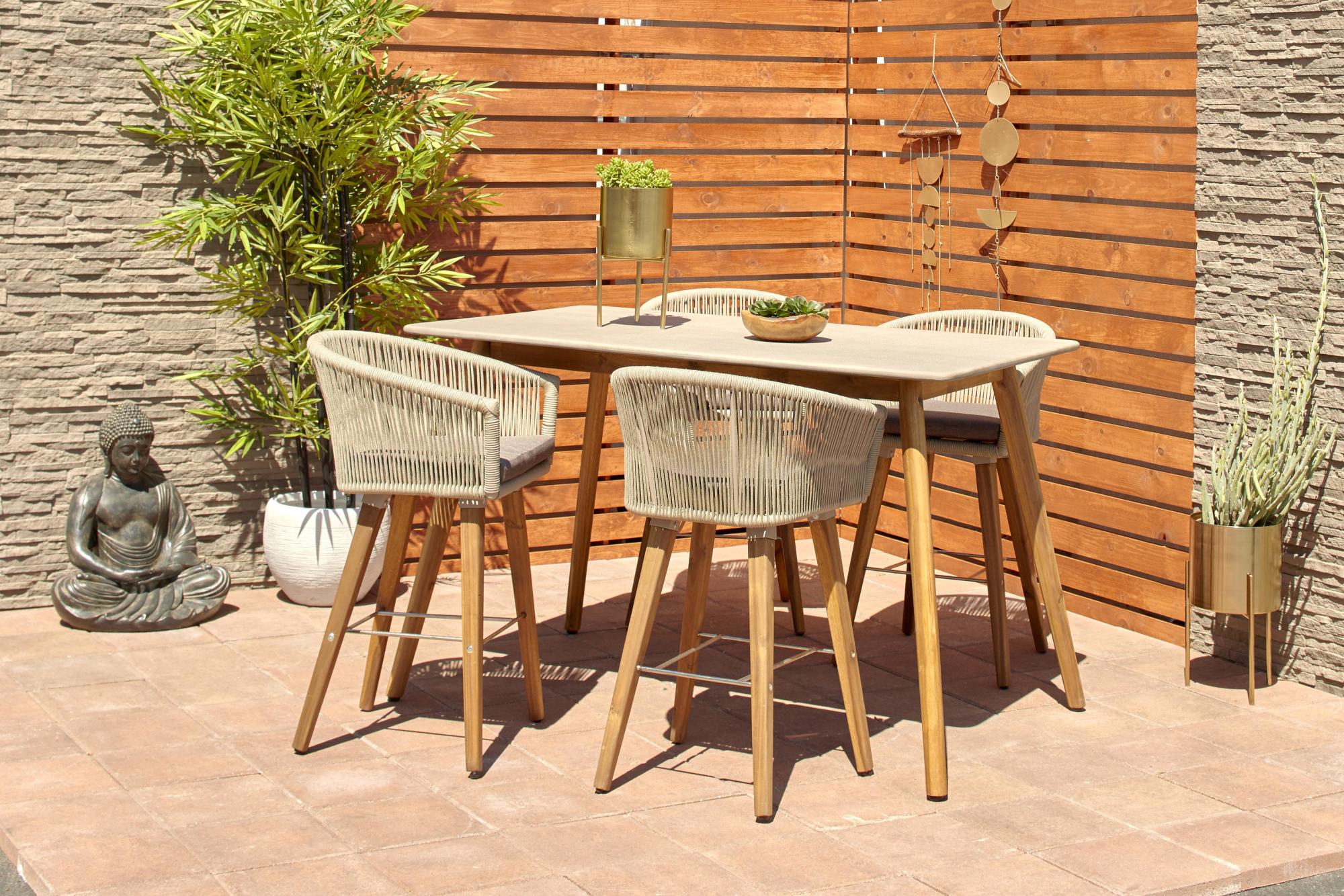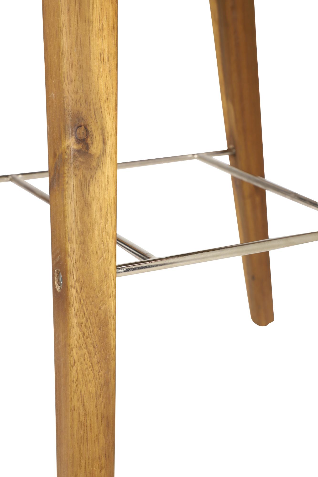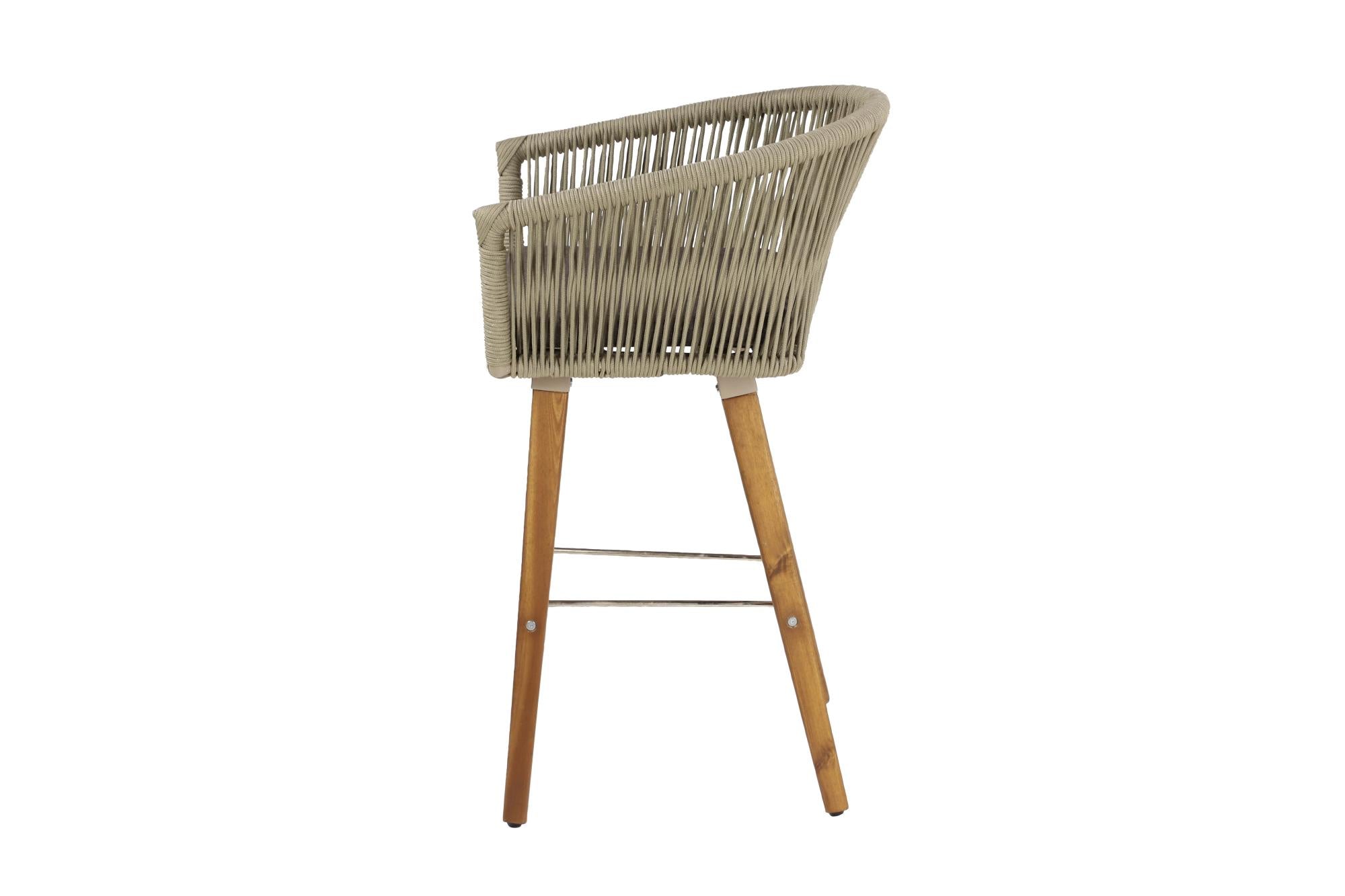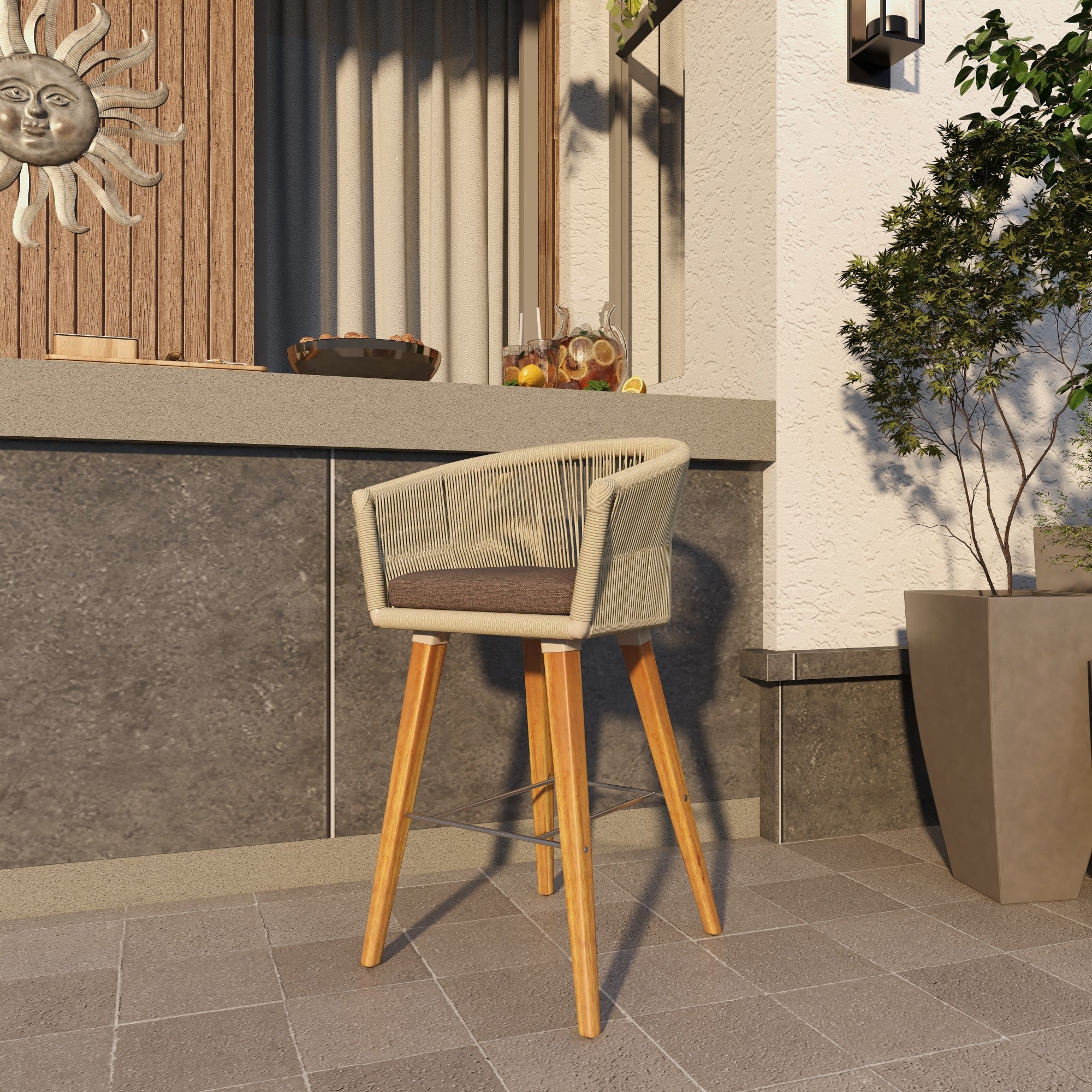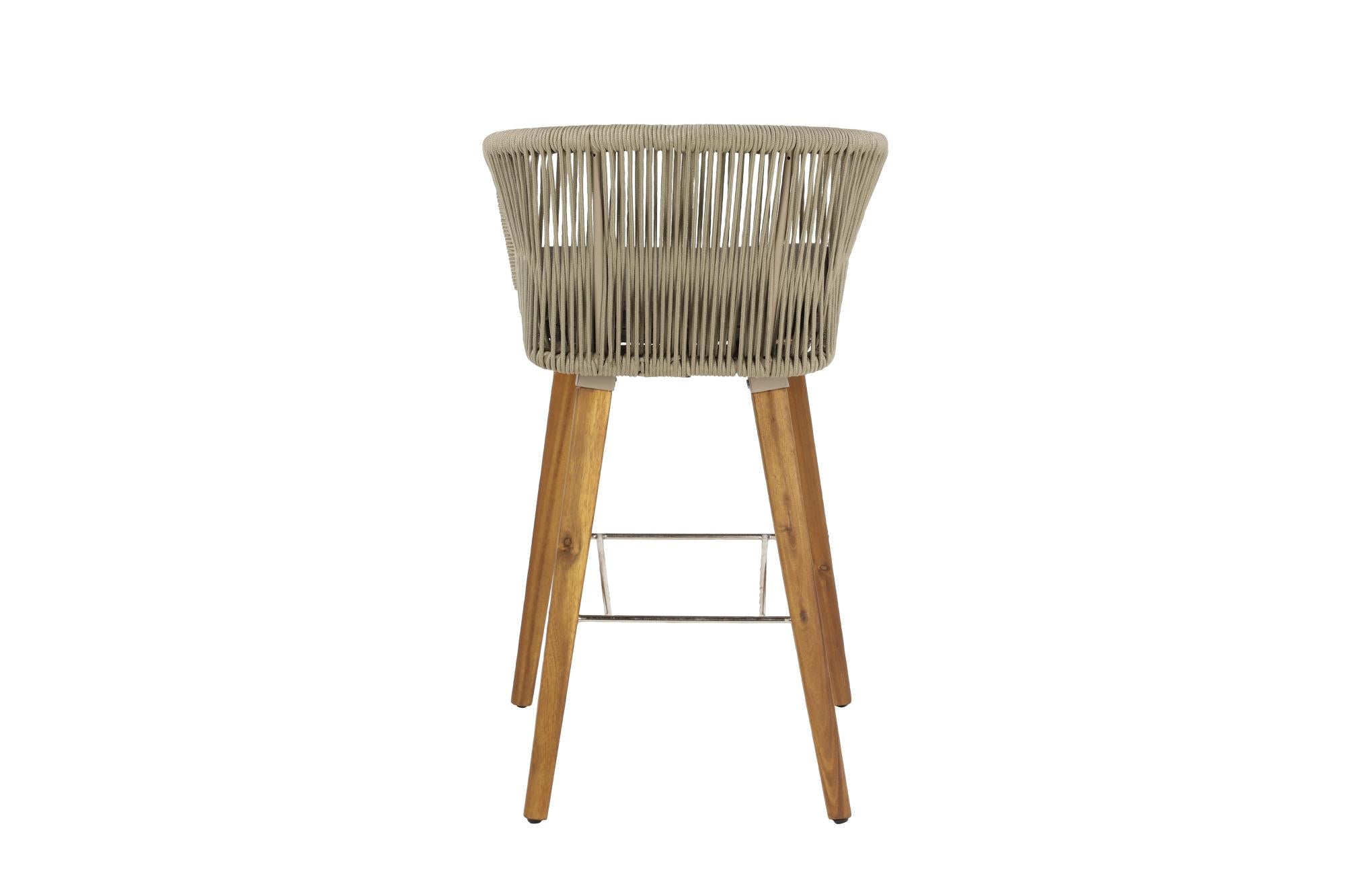 Make memories and laughter in the kitchen as you sit pretty in this stylish bar stool. Find comfort in our bar stool featuring eye catching design and durable structure. Place the bar chair in your kitchen or dining area to add modern flair while offering functional seating. This item ships in 1 carton. Cushions should be stored indoors when not in use. The fabric will fade over time, be sure to turn cushions regularly to equalize the color change.. Polyester cushion cover is removable and machine washable with soap and water. Suitable for indoor and outdoor use. Some assembly required. Maximum weight limit is 250 lbs. Made in Vietnam. Can accommodate 1 person. This is a single kitchen stool. Modern style. Acacia wood, aluminum and PP rope are highly durable and are all resistant to water.