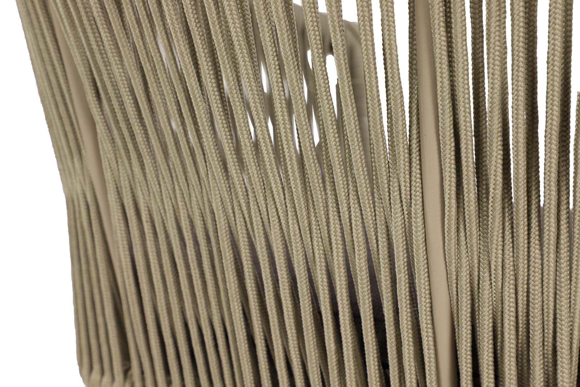 •This fabric bar stool boasts a curved back that slopes to armrests supported by fishbone woven rope and includes a detachable cushion for comfort