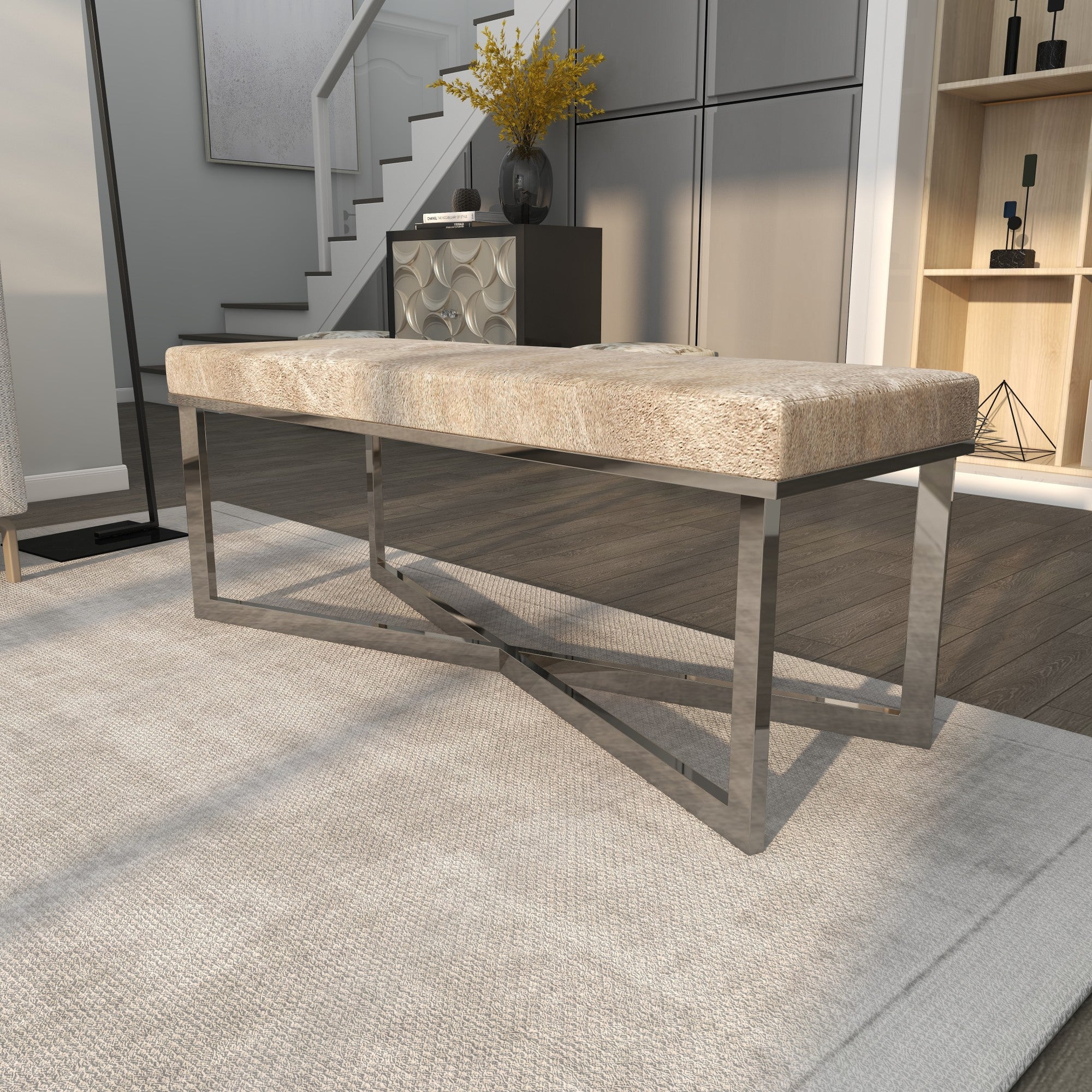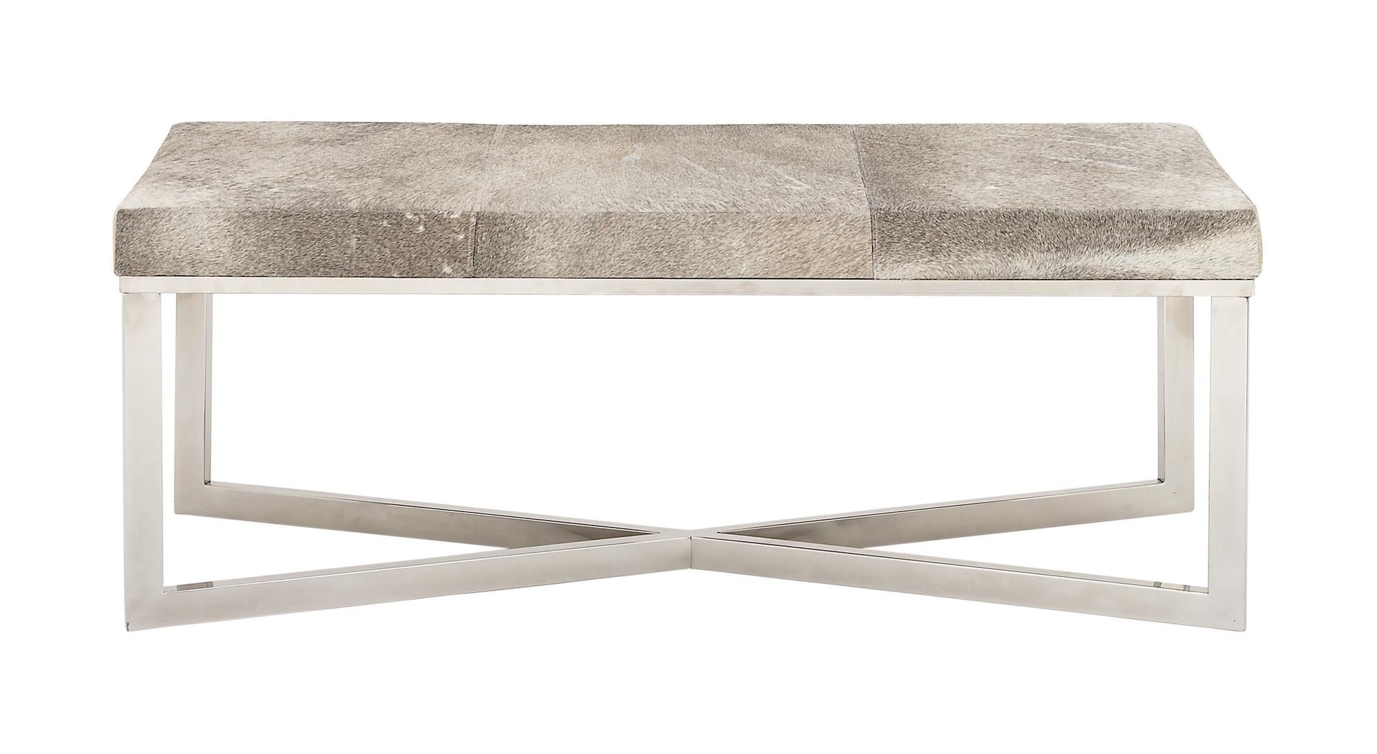 Gray Leather Handmade Cowhide Home Bench with Silver Metal Base