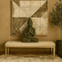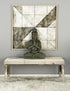 •This polished entry bench features a rectangular shape with X-shaped legs and a patchwork pattern