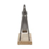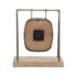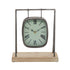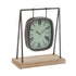 •Wood clock showcases square face with Roman numerals, suspended from a metal frame that rests on a wooden base, adding a touch of rustic charm to its overall design