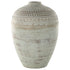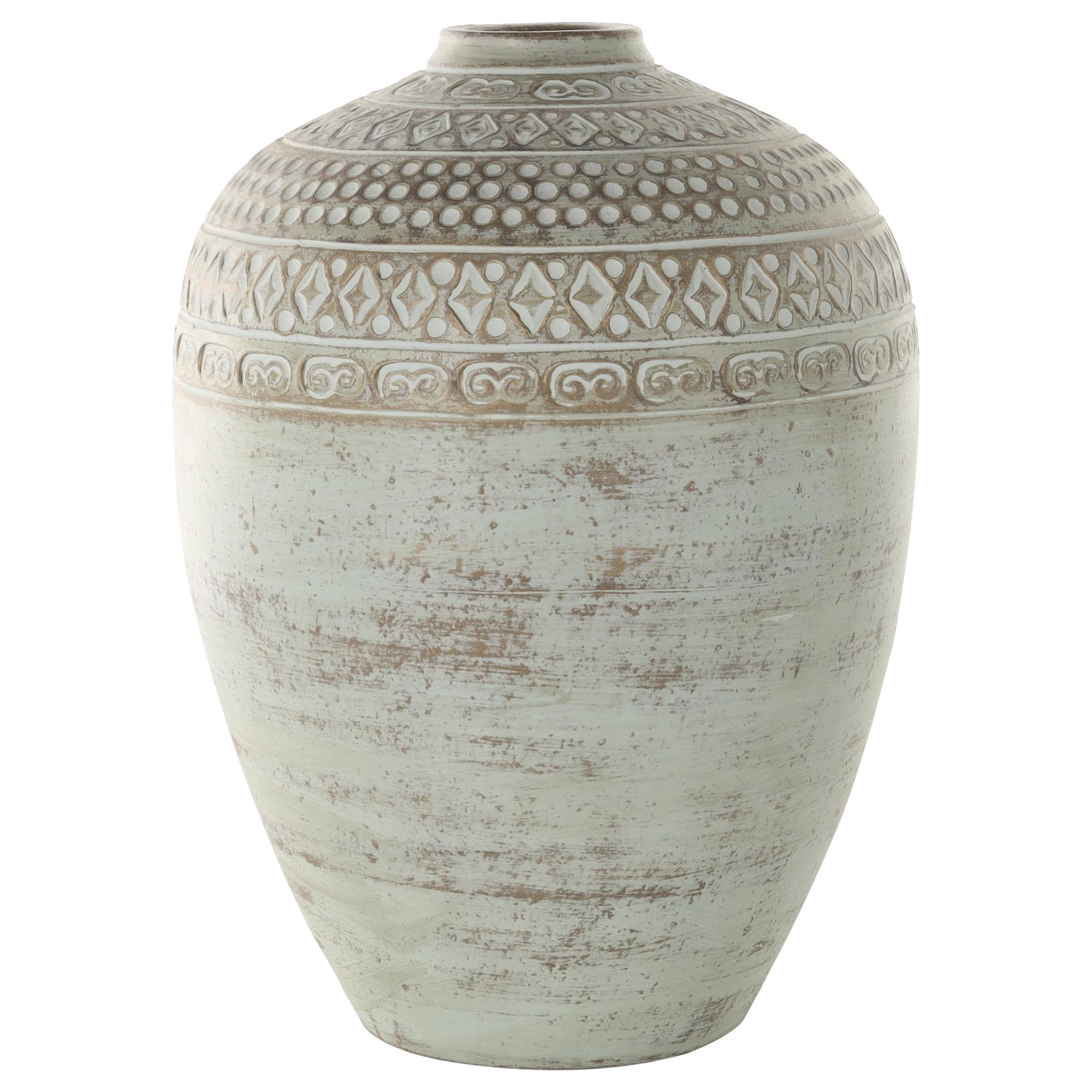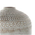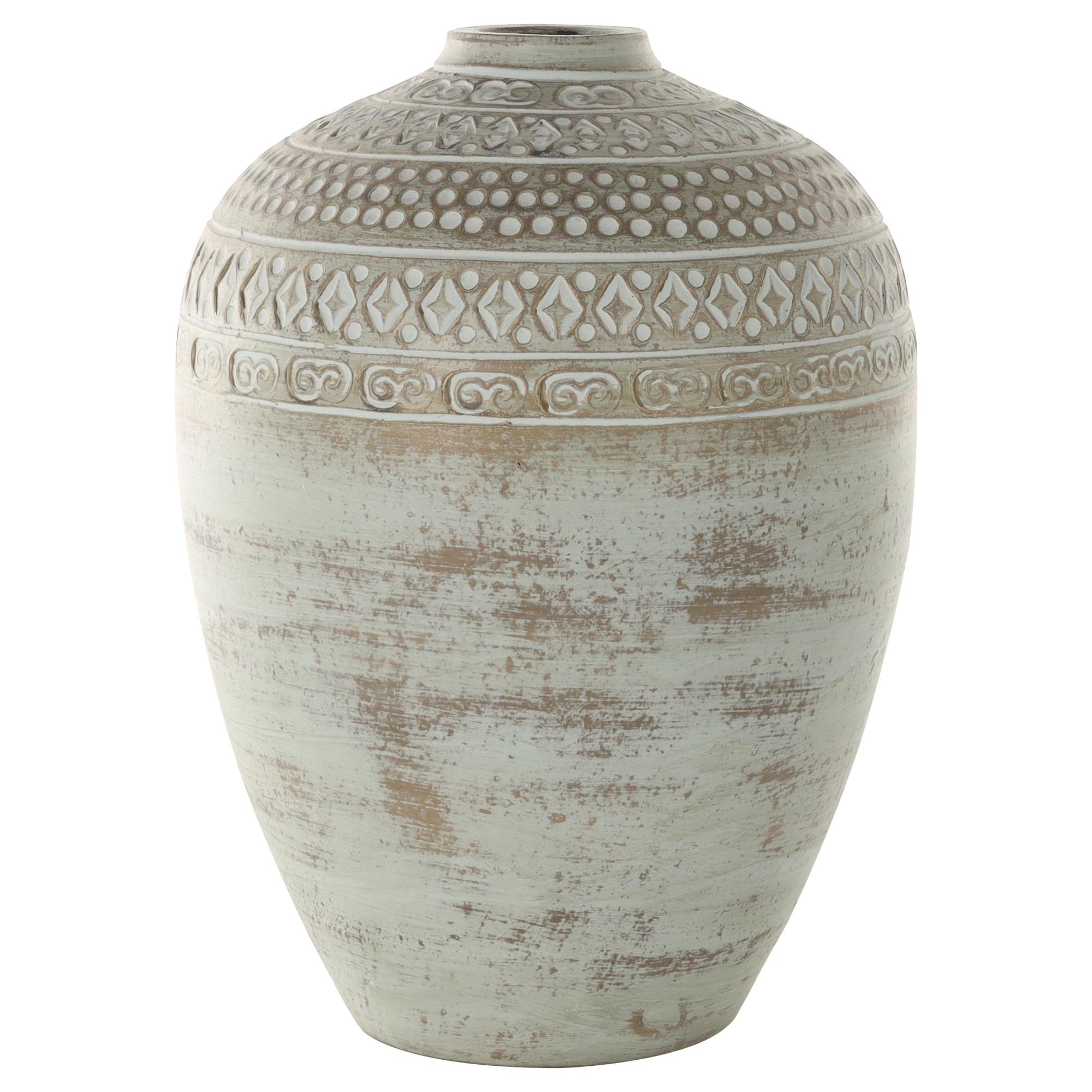 •This ceramic vase features tribal carvings that make it a striking focal point in any rustic interior