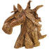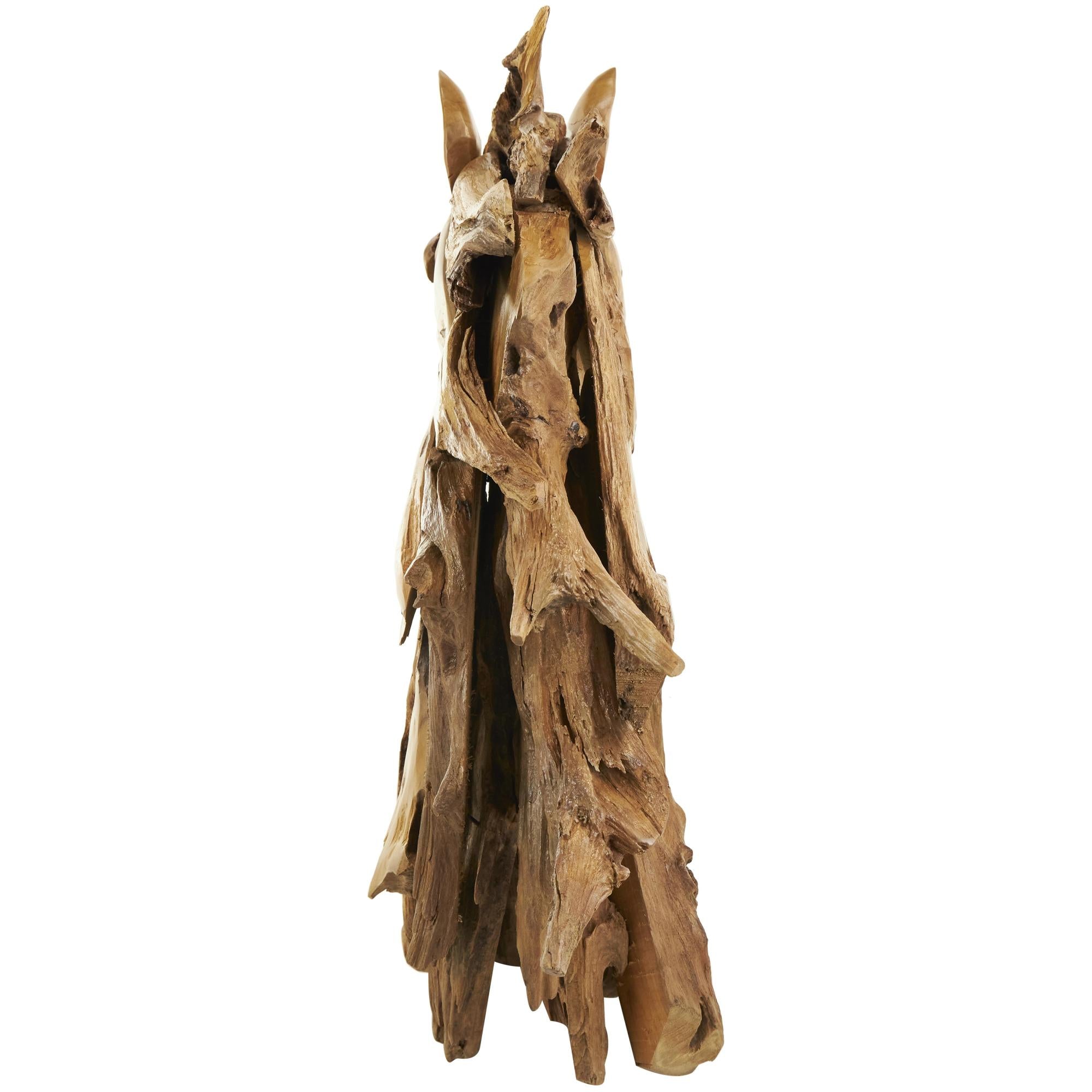 •Bohemian accent statue is made with nails securing the carved teak wood pieces together forming a horse head