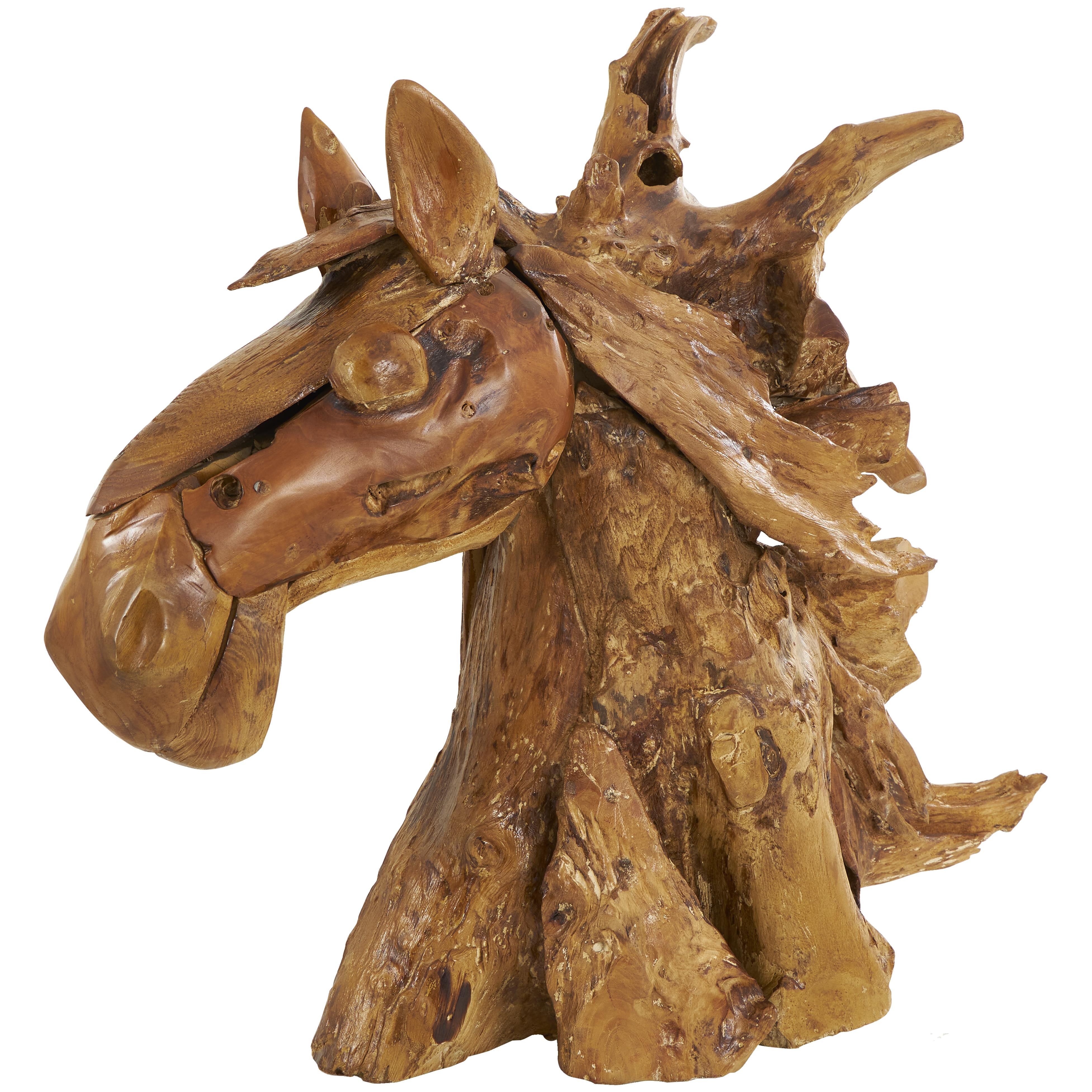 Perfect for any living room or study, this horse home decor statue brings an earthy charm. This item ships in 1 carton. Please note that this item is for decorative use only. Teak sculpture makes a great gift for any occasion. Due to the handmade nature of this item, no two will be alike, there will be slight differences in shape, size, and color. Suitable for indoor use only. This item ships fully assembled in one piece. Due to the live edges of the piece, each is unique, so no two products will have an identical pattern, shade, or cut. Made in Indonesia. This is a single statue. Bohemian style.