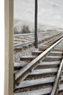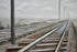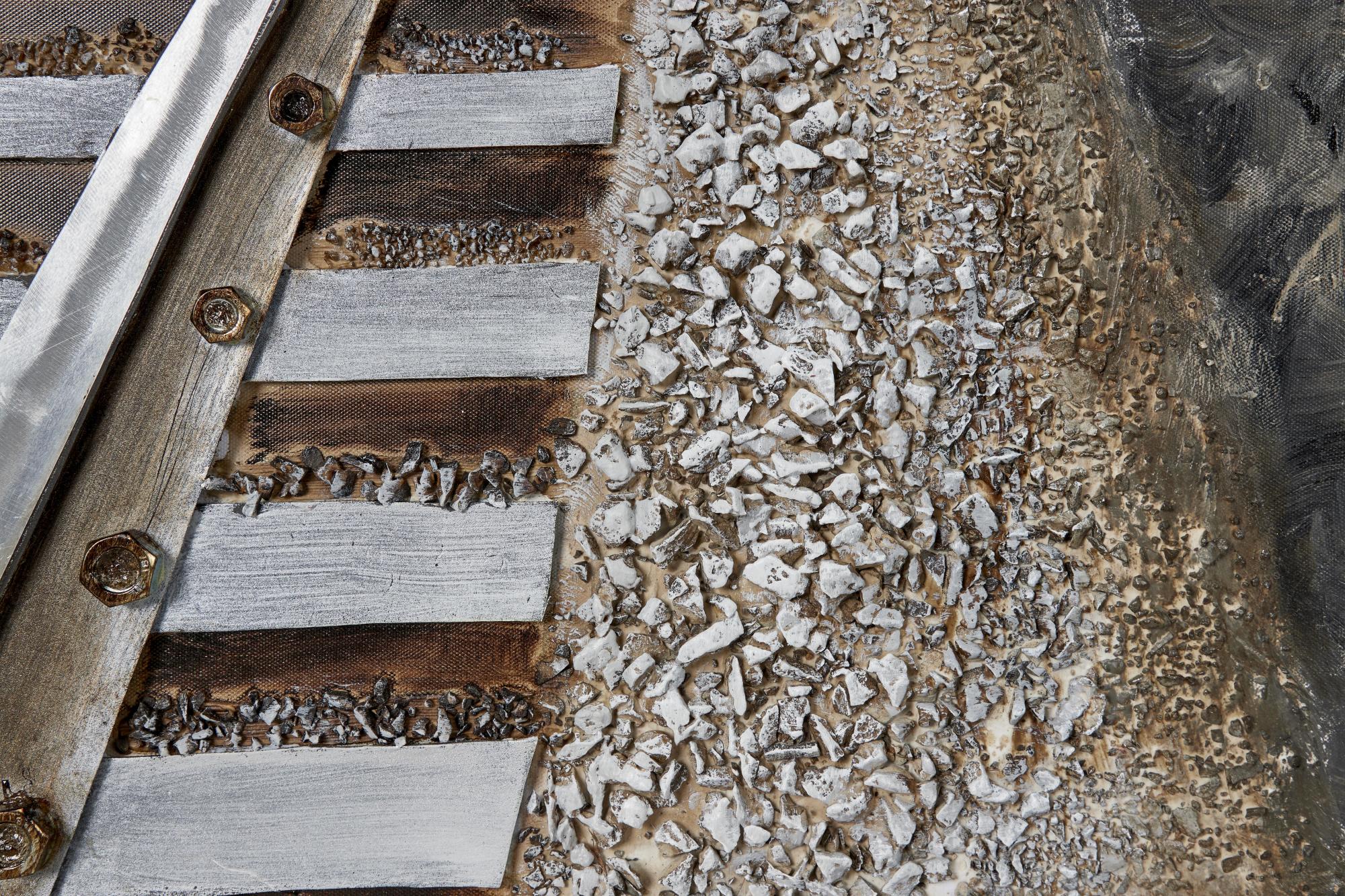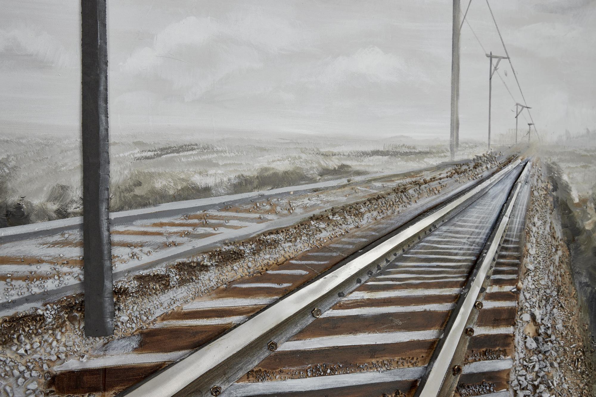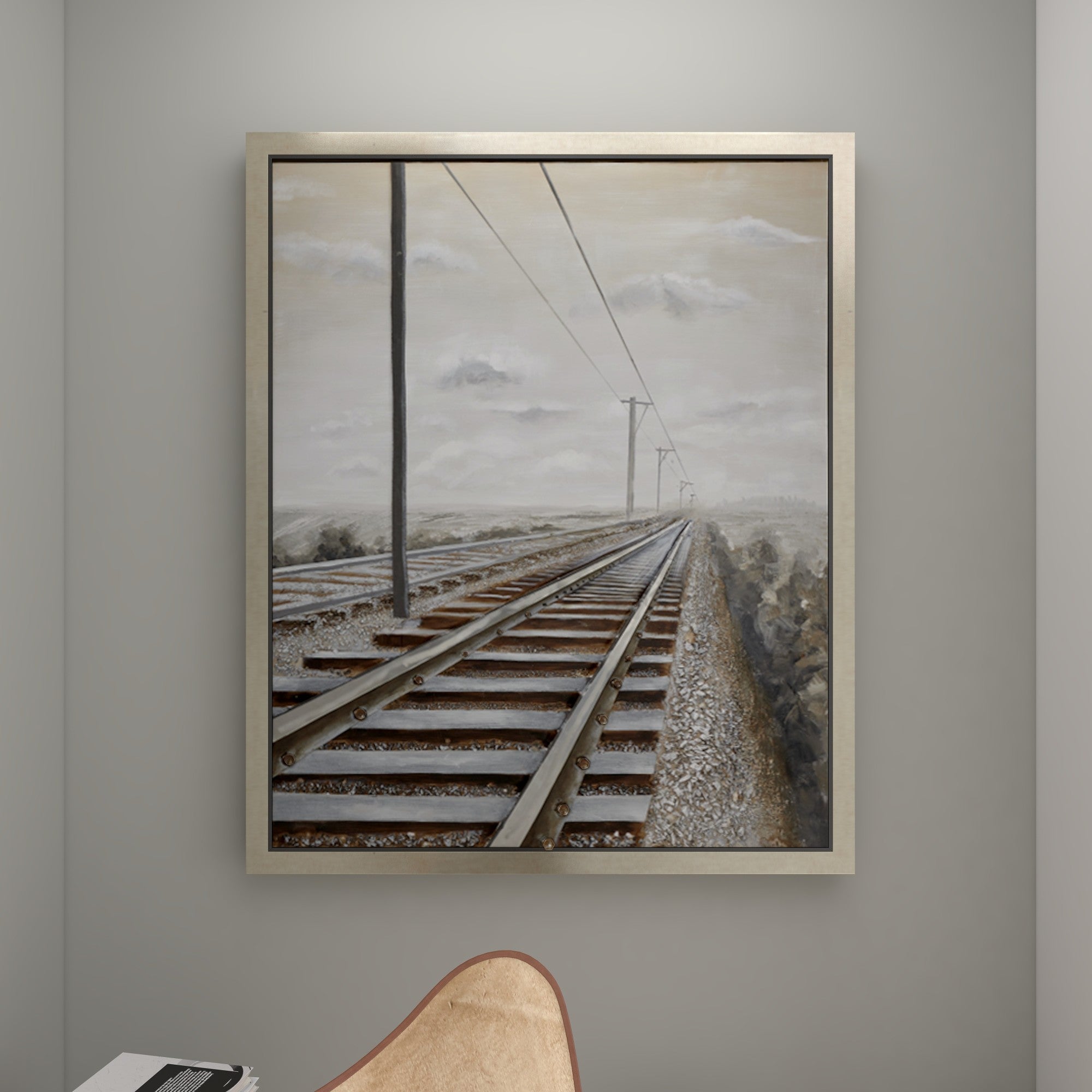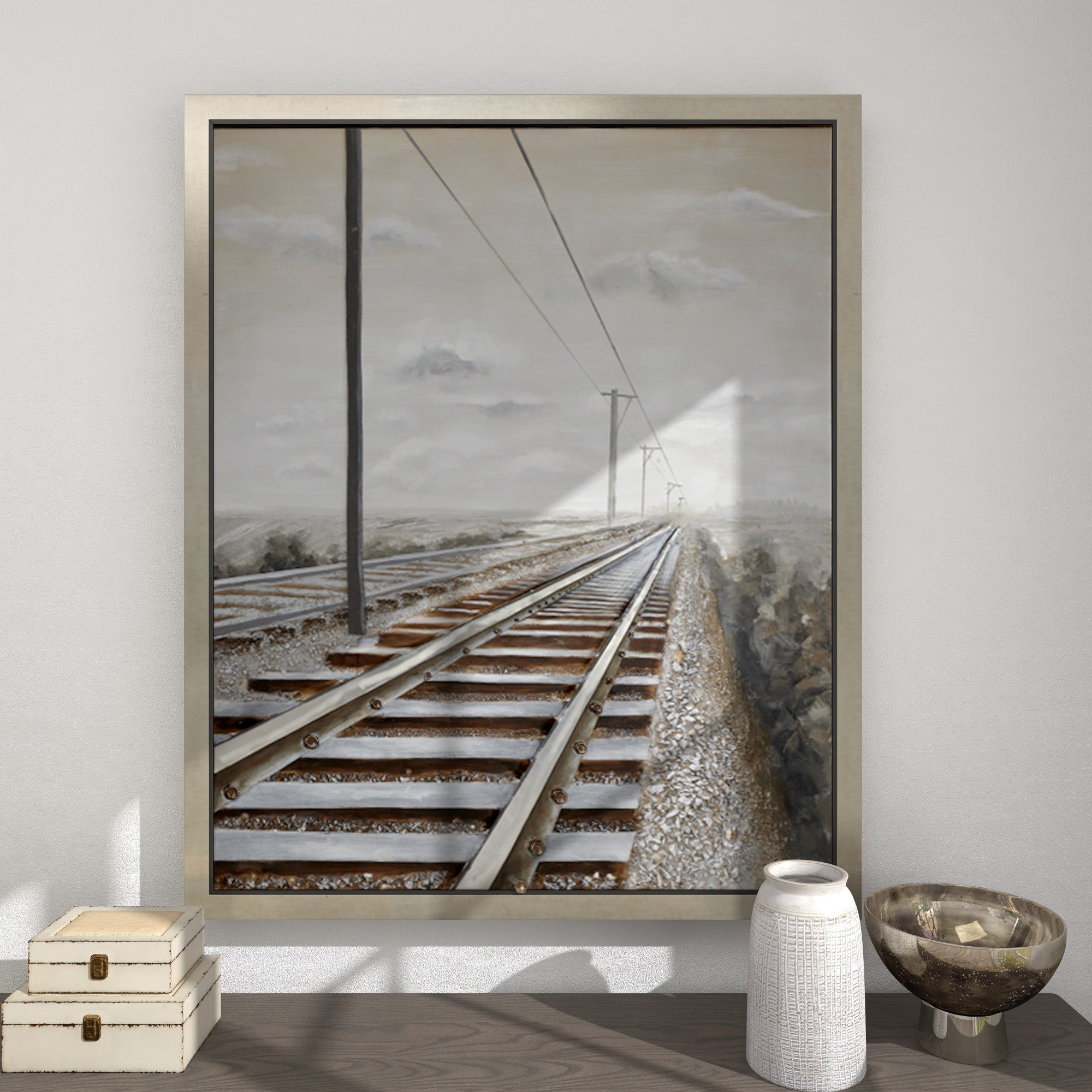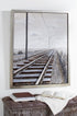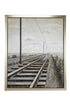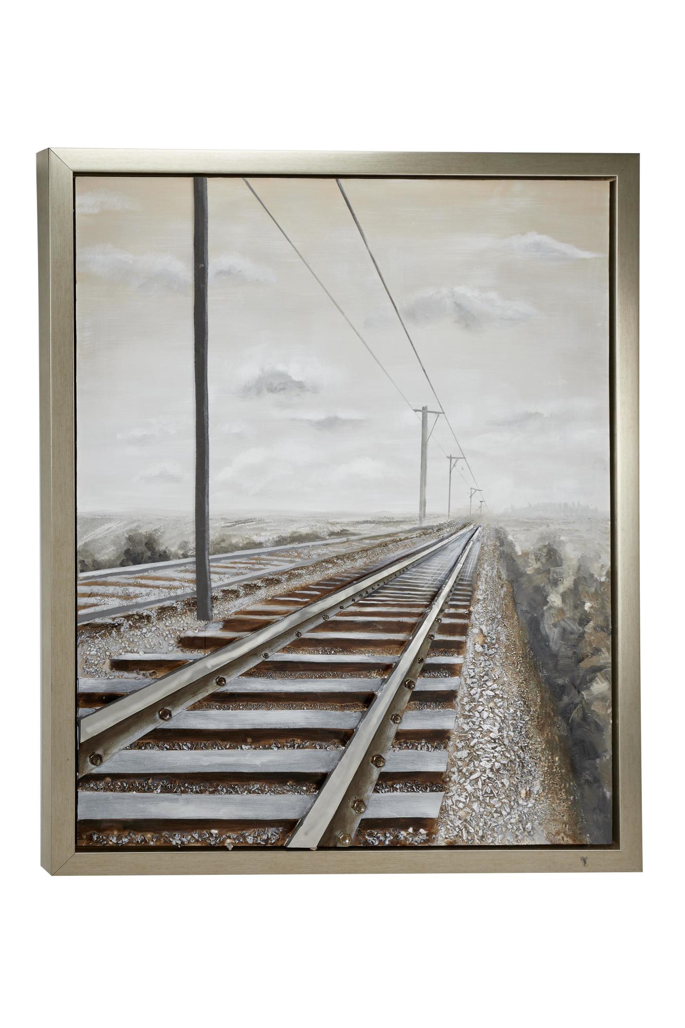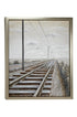 •The textured wall framed art features railroad tracks and power lines disappearing into the horizon within a rectangular frame