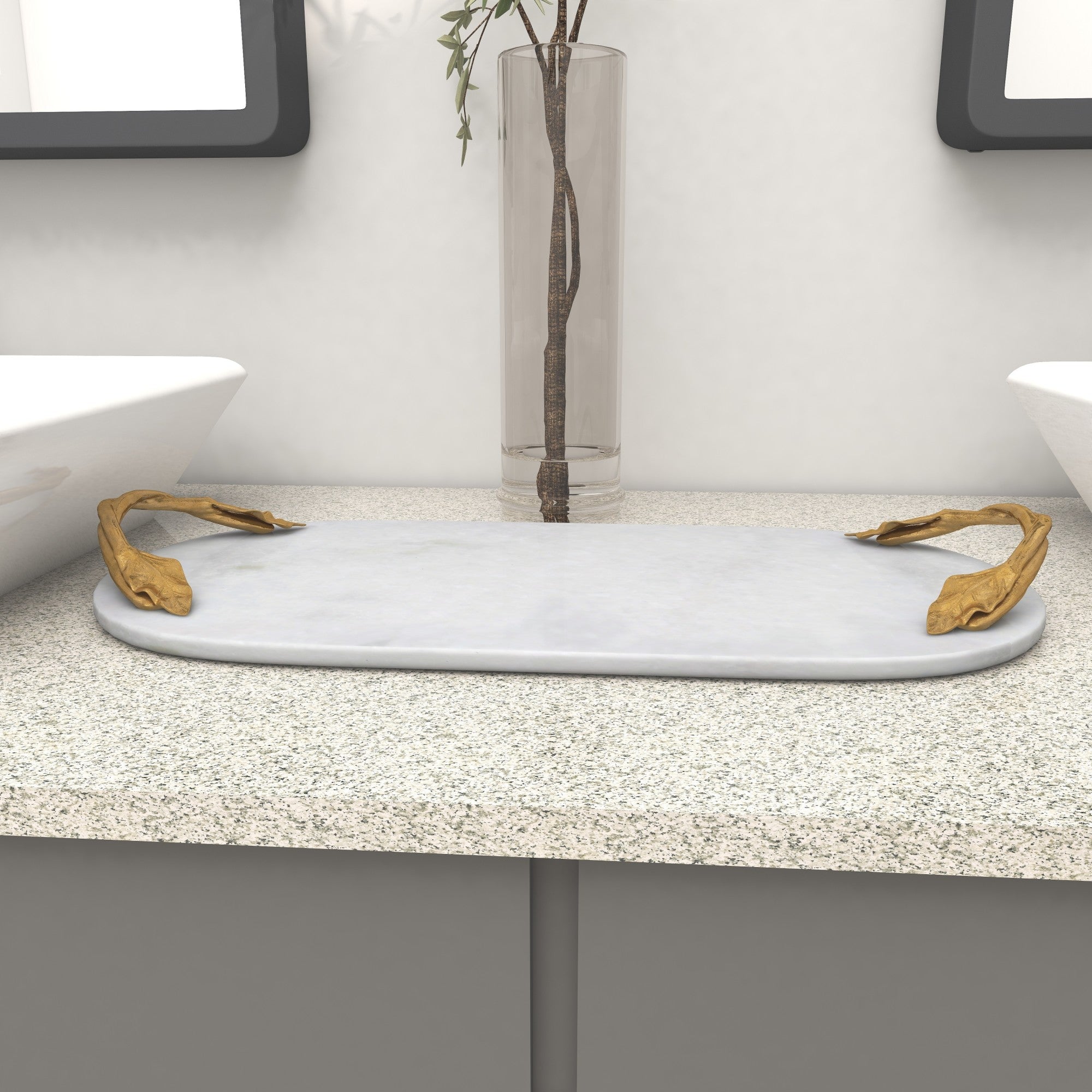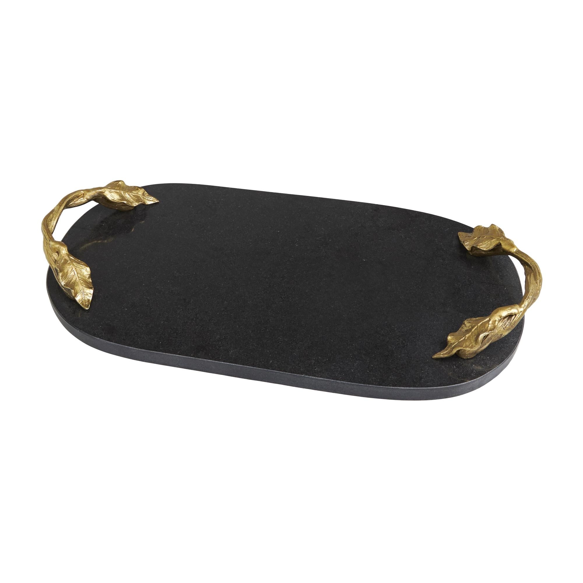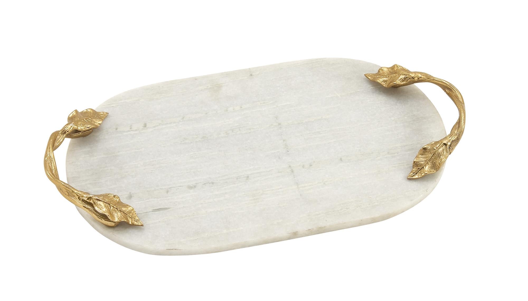 •The glam multipurpose tray features molded marble material to form the base, and it attached with aluminum handles molded to form leaf designs