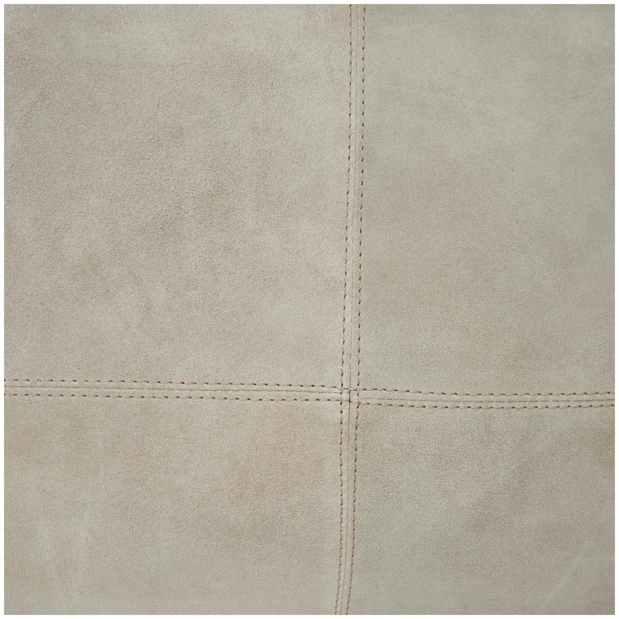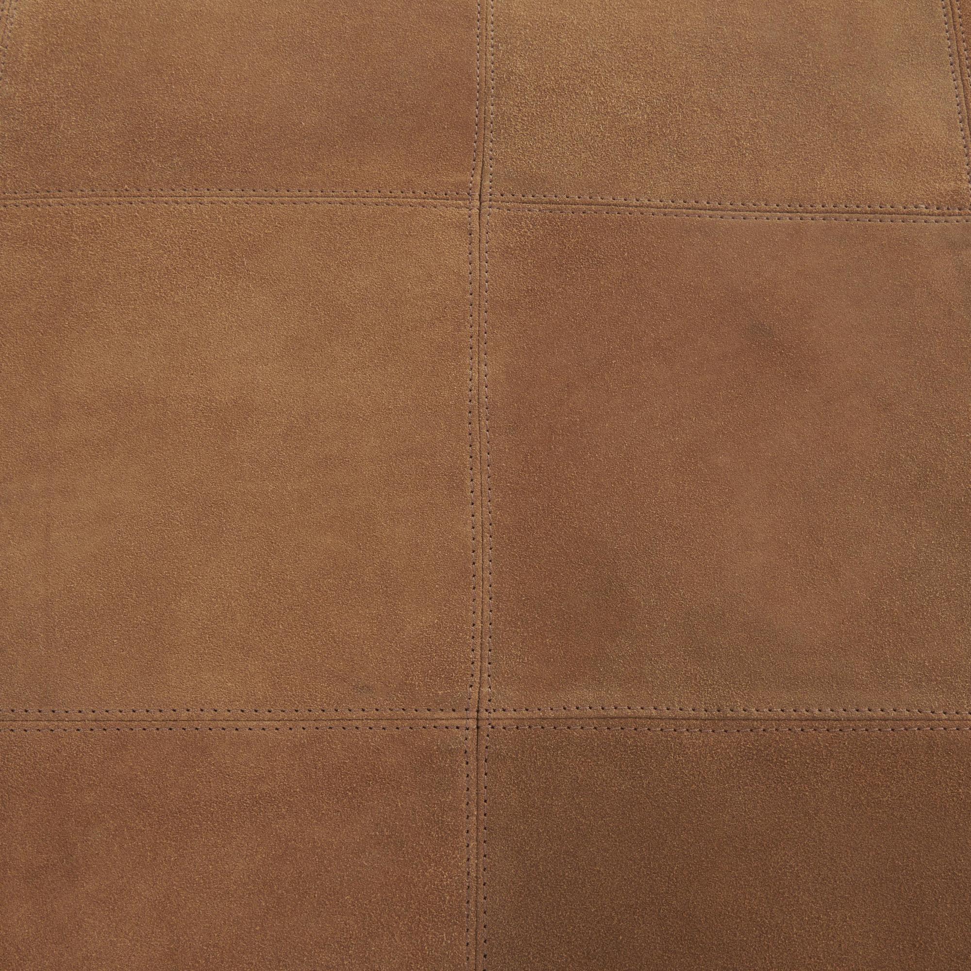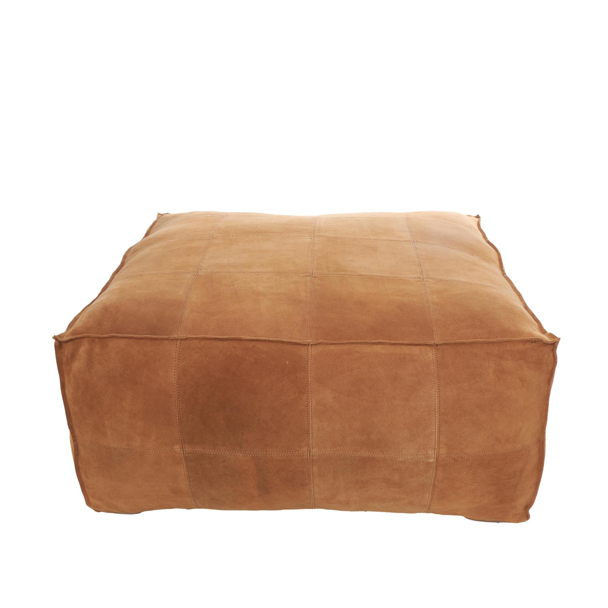 •The leather pouf features a stylish low-profile design with patchwork details and exposed stitching, making it an eye-catching piece that doubles as additional seating