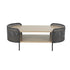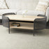 •This wood living room table features a unique two-toned design with mesh side panels and one shelf for added storage space