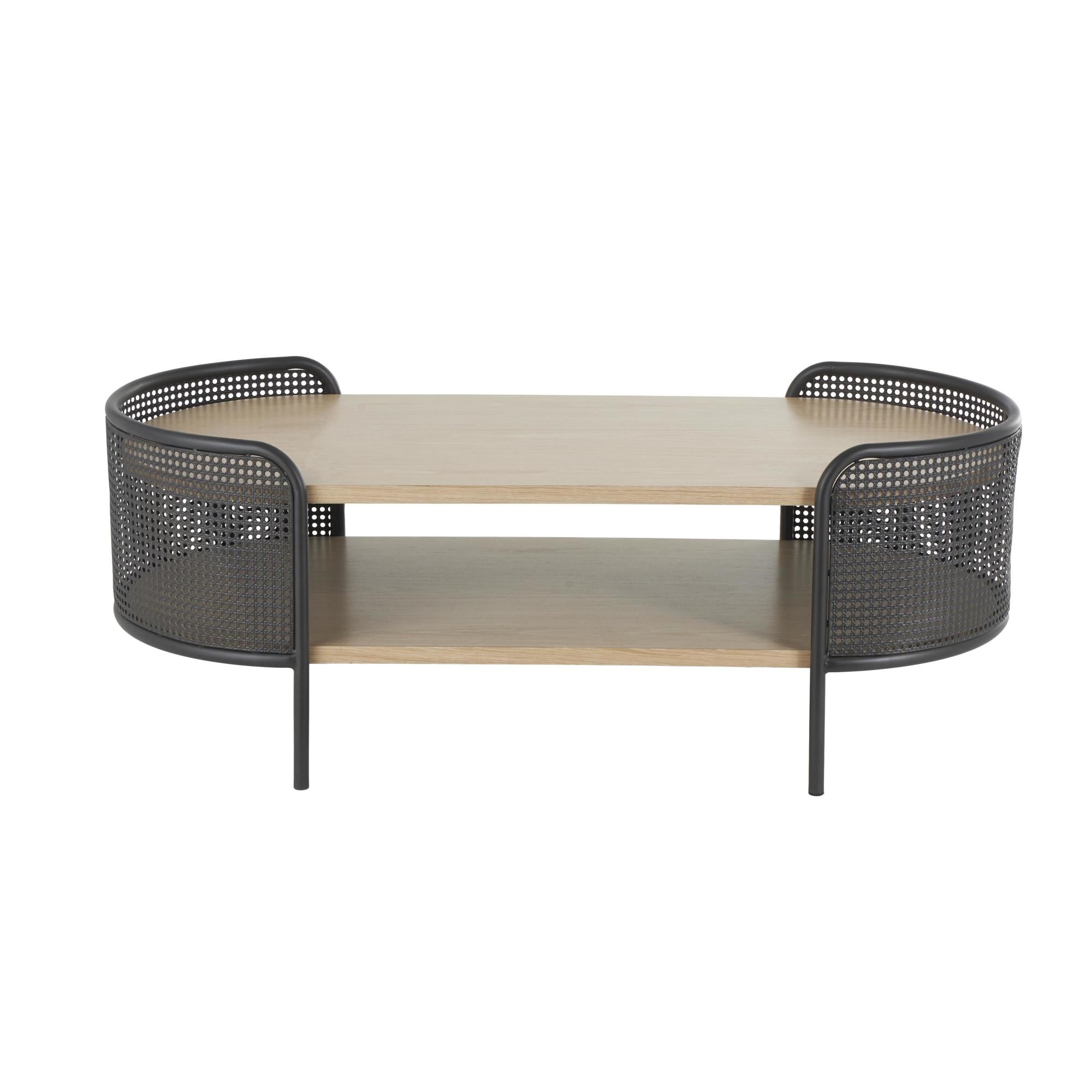 Light Brown Wooden Oval Two-Toned Living Room Coffee Table with Mesh Side Panels and Brown Wood Tabletop