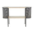 •This traditional home console table features a tabletop and shelf carved from MDF, which are secured onto welded iron side mesh panels with legs