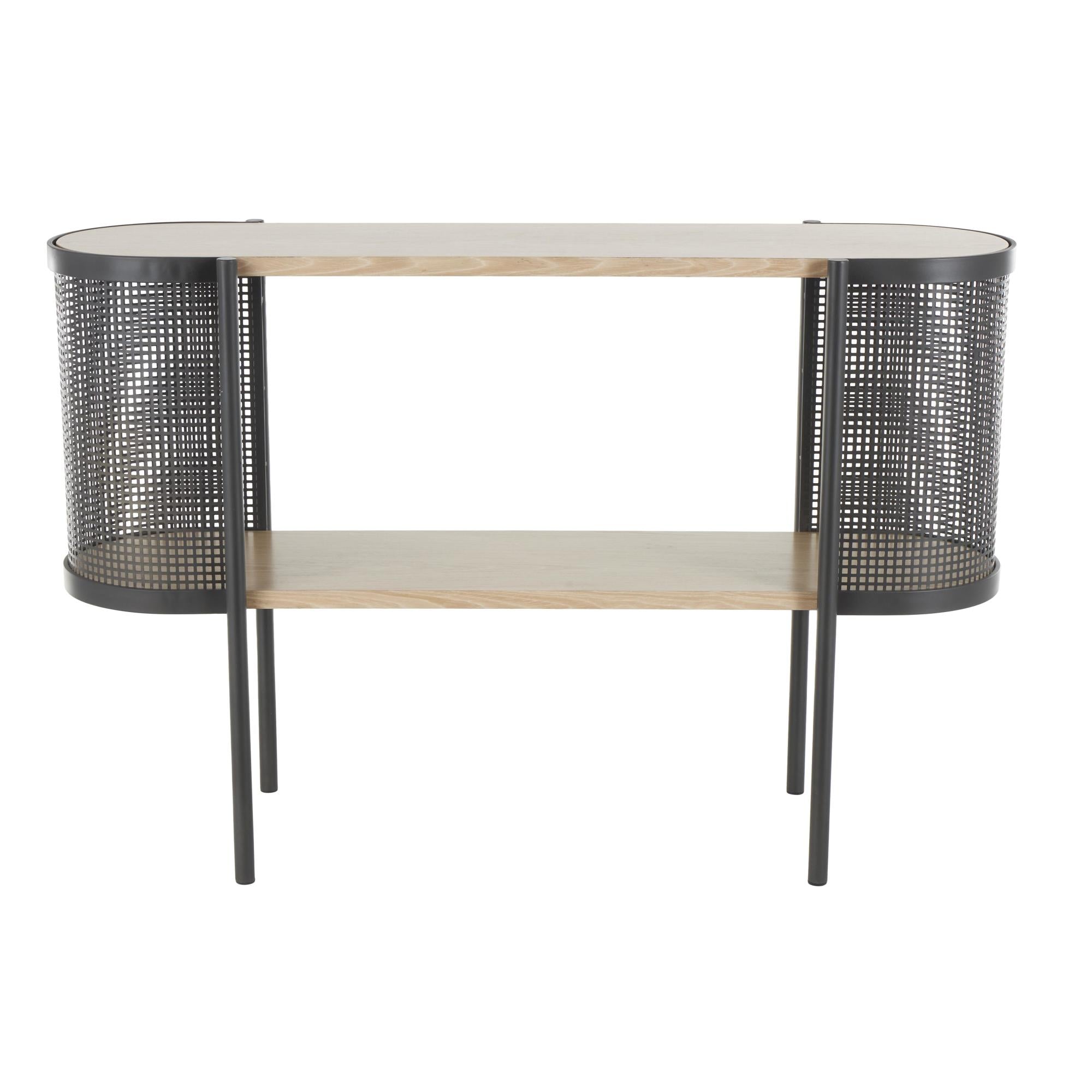 Light Brown Wooden Oval Two-Toned Living Room Console Table with Mesh Side Panels and Brown Wood Tabletop