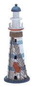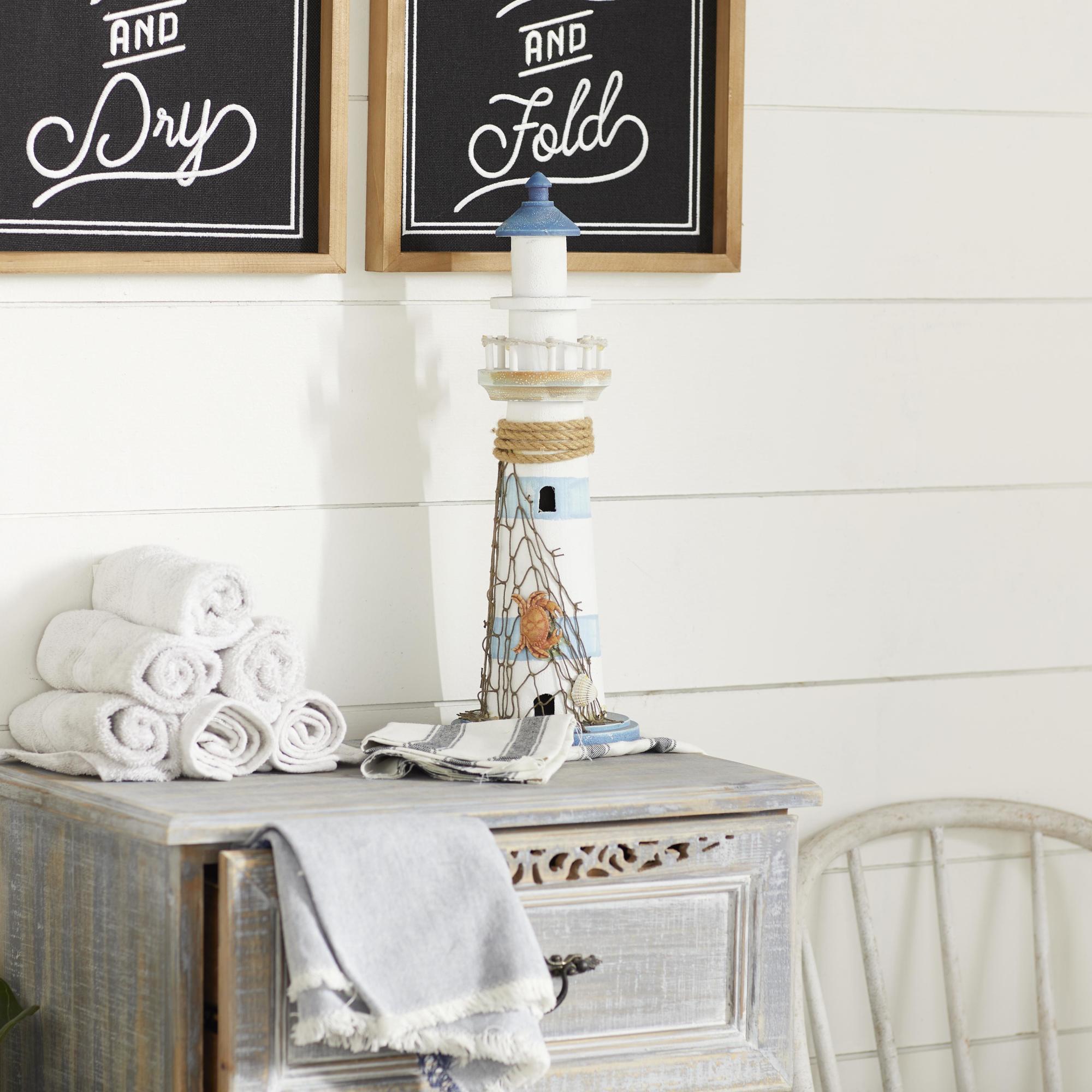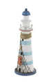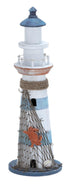 •The washed home decor figurine is a coastal lighthouse sculpture with netting and a sleek, modern design