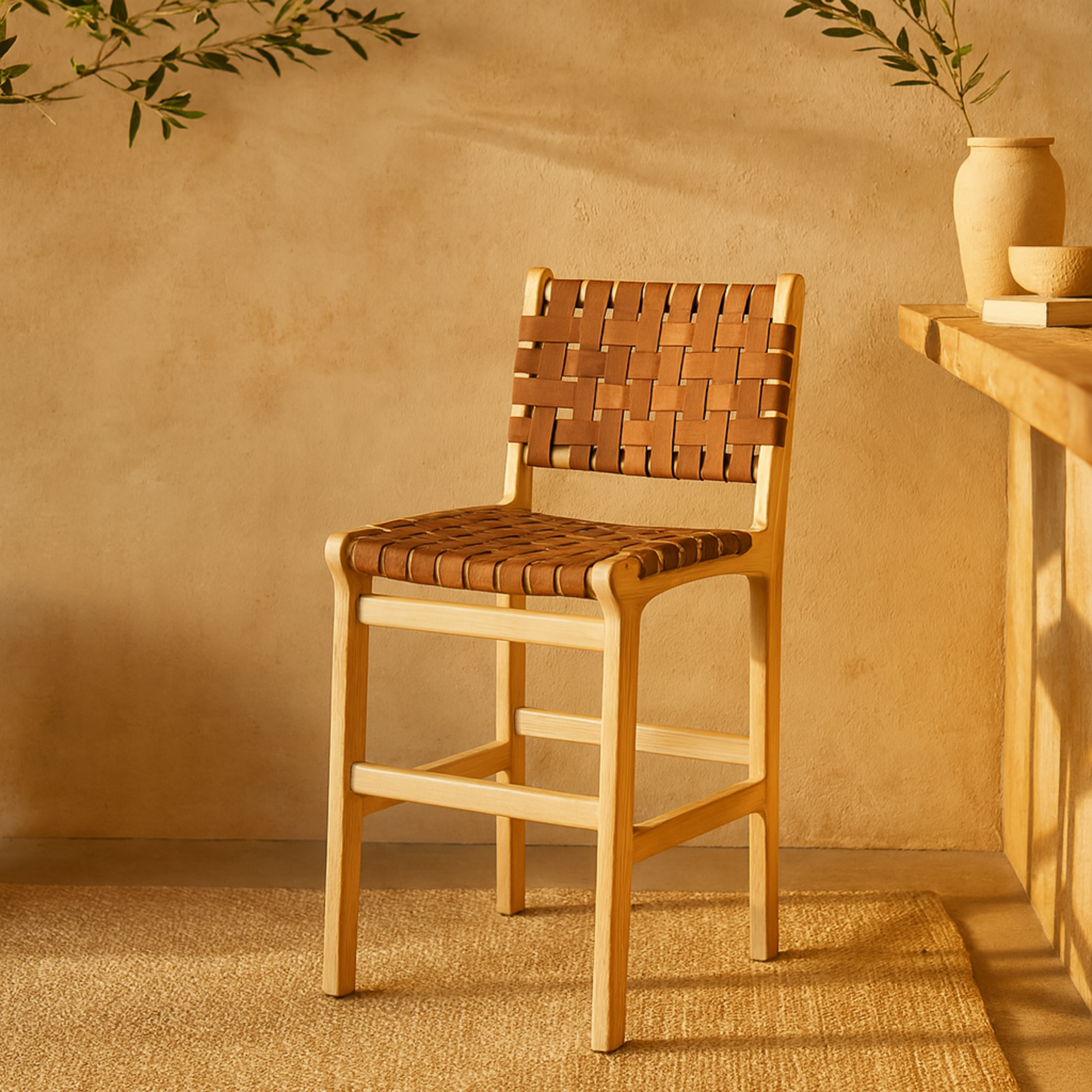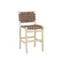 •The kitchen bar stool boasts a mango wood frame for stability, complemented by a woven leather seat that adds a touch of bohemian flair