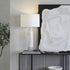 •With its modern design, this polished accent lamp for table highlights a drum fabric shade paired with a cylindrical marble frame