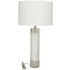 •This modern living room table lamp is shaped from marble attached to a stainless steel rod, with crystal pieces attached at the top and bottom, and a cotton drum shade secured on top