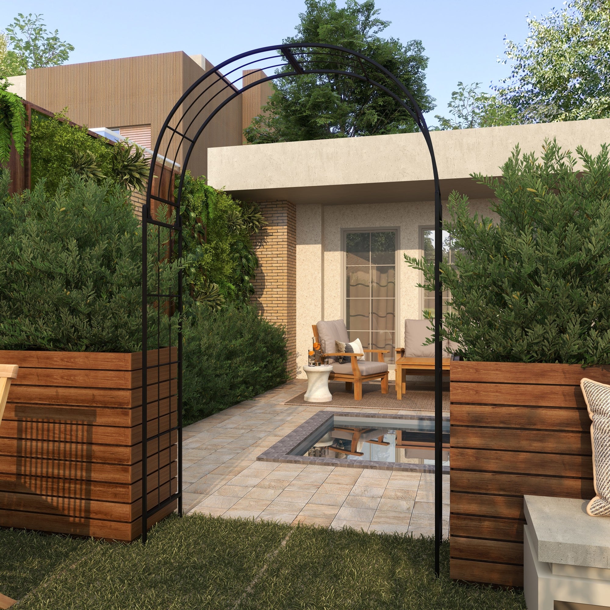 A creative way to add a welcoming look with bold design into your outdoor setting. This garden arbor is perfect for creating a focal point over in your outdoor patio space. Welcome your guests while flaunting your flowering vines with this garden trellis for climbing plants in your entryway or garden. This item ships in 1 carton. This metal pergola arbor features a minimalist design with lattice work that serves as a functional addition to your garden or yard. Suitable for indoor and outdoor use. Some assembly required. This is a single garden arch. Contemporary style.