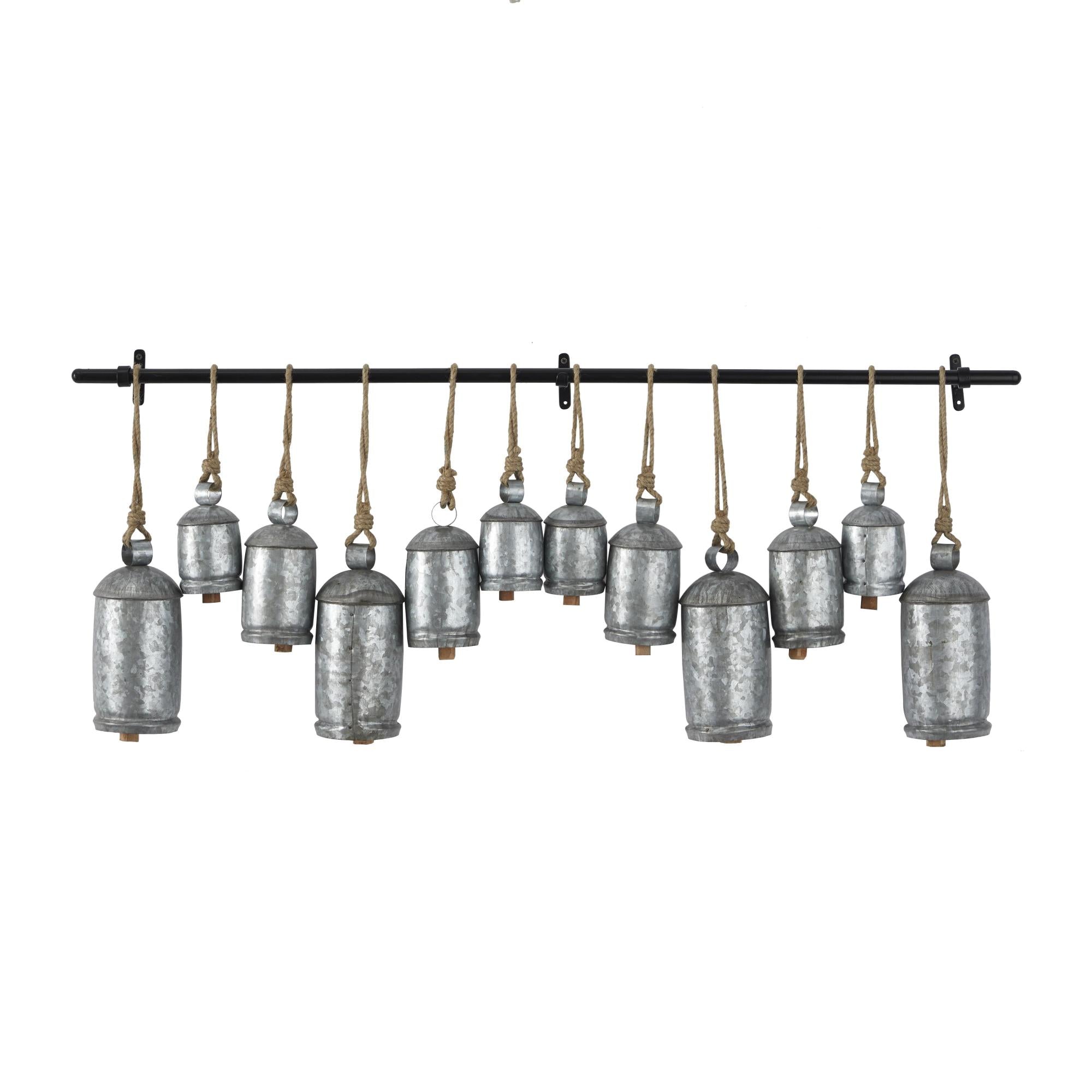 •The metal decorative cow bells feature 12 various-sized pieces hanging horizontally through jute rope from a slim rod, adding dimension to your space