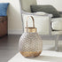 •The eclectic candle holder lantern features molded iron to form the round body adorned with perforated designs, with a handle screwed at the top