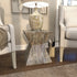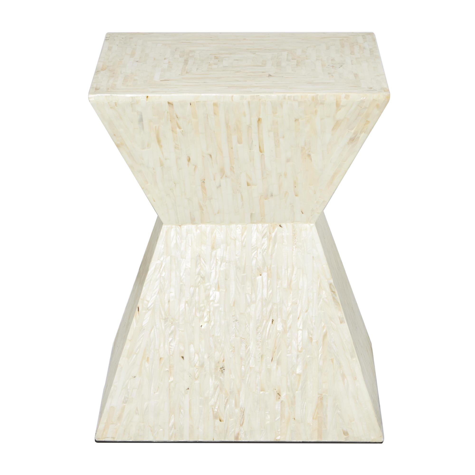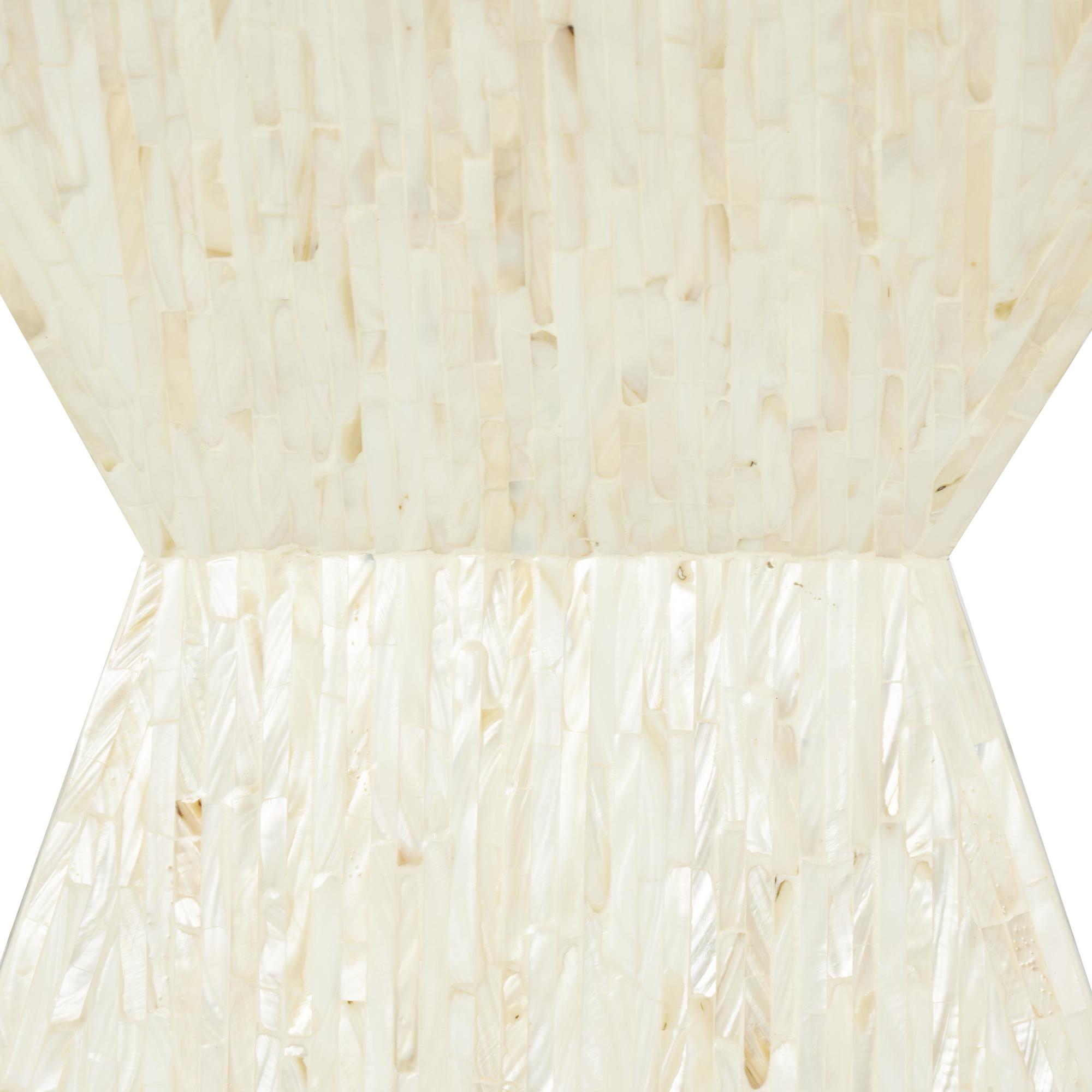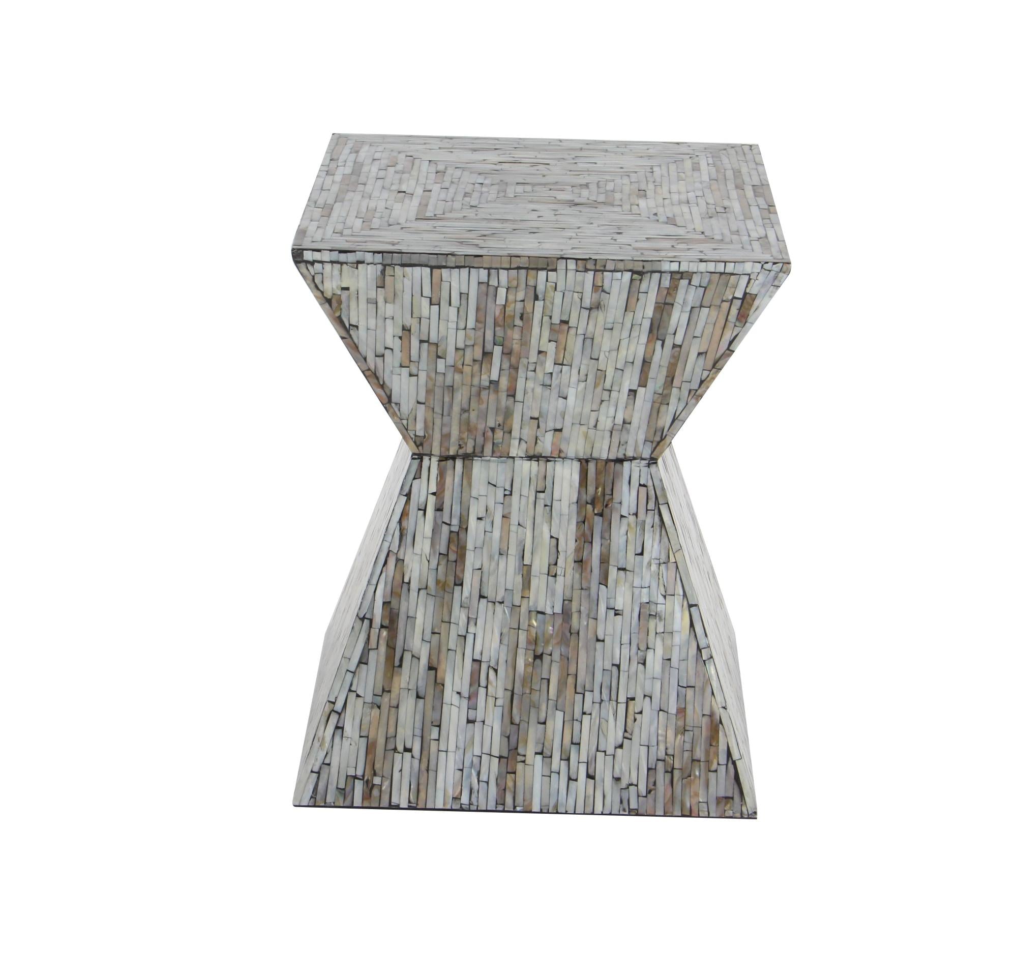 •The mother of pearl accent table features an eye-catching hourglass shape with a vertical mosaic of shells on its exterior, making it a stunning statement piece
