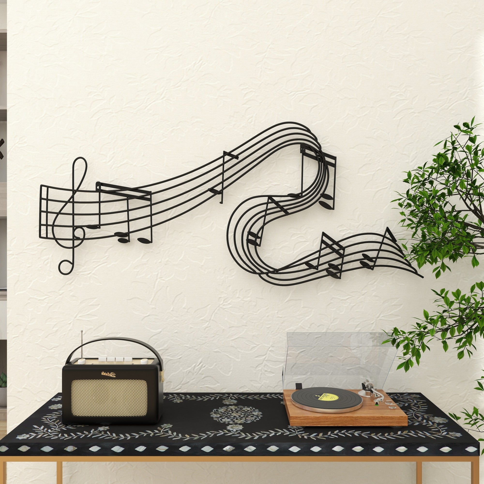 •In crafting this traditional room wall decor, iron has been skillfully welded to form the musical notes which are then mounted on a metal baseline