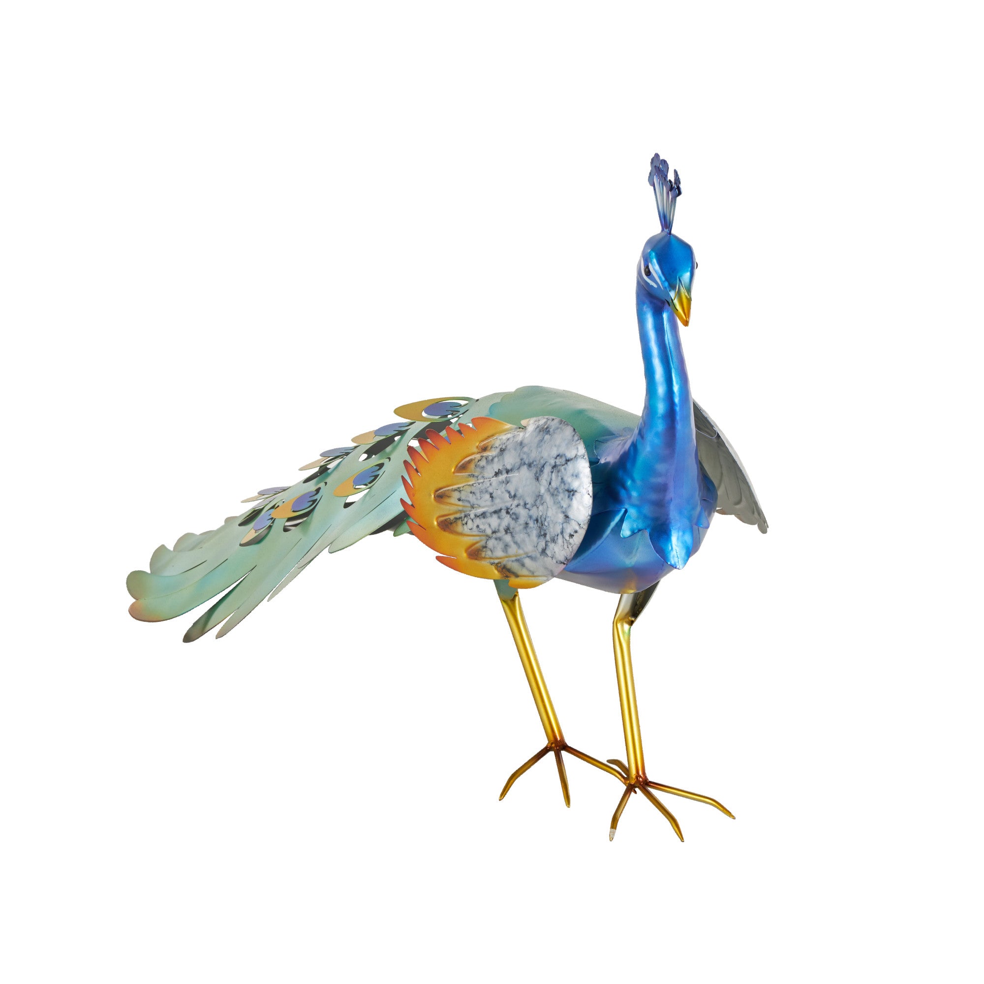 Peacock Blue Metal Decorative Garden Sculpture with Gold Legs and Teal Wings