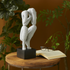 •Textured home decor figurine is shaped like a sitting person holding their head on a square base, creating an interesting play of light and shadow