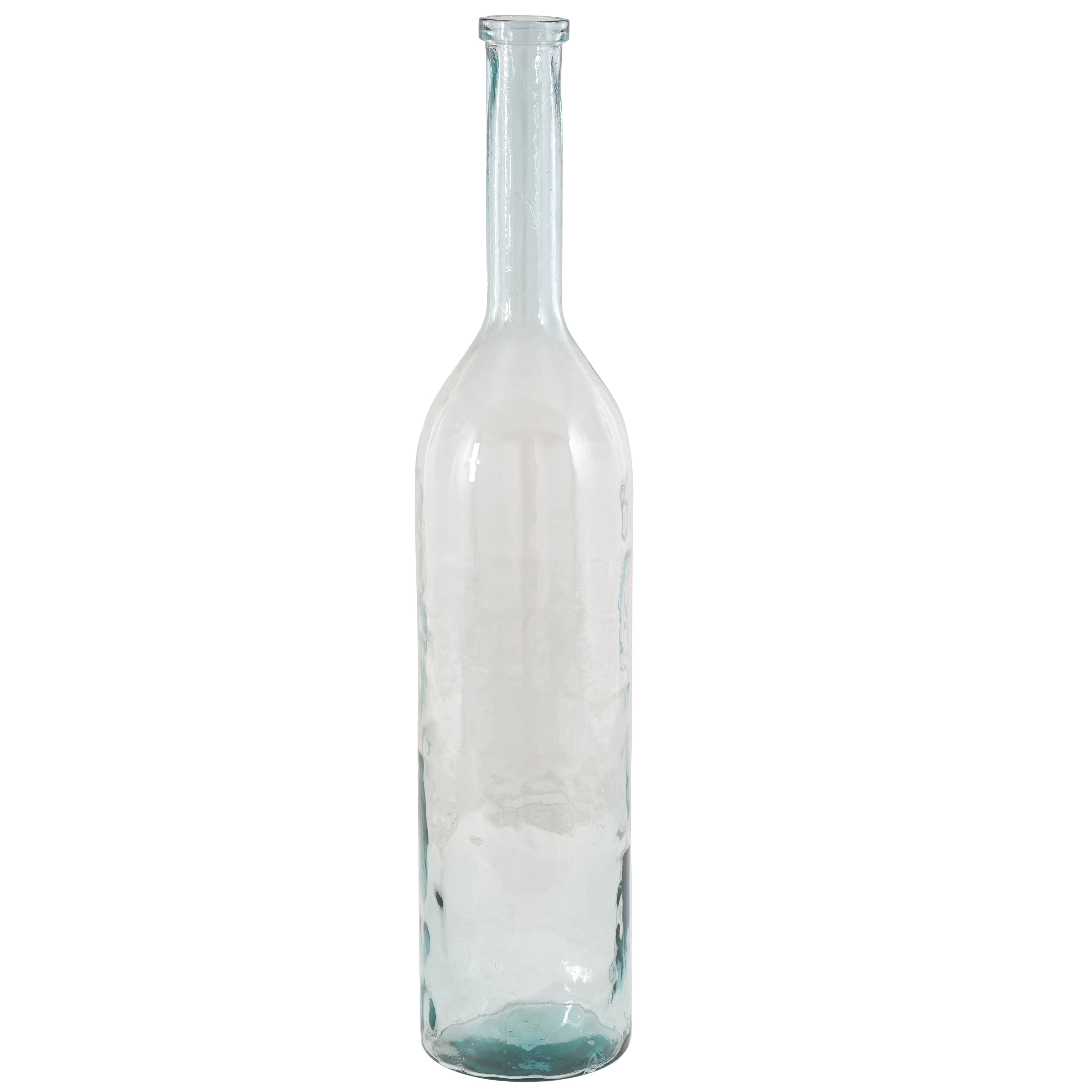 •This recycled glass vase has a wide base that leads to a long neck with a small round opening, making it perfect to hold long and thin decor or single flower stem