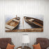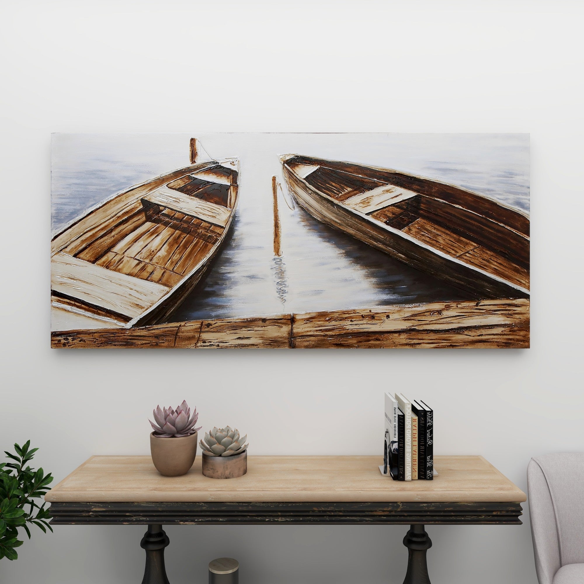 •Textured wall art decor canvas showcases a rectangular shape with an expansive depiction of two empty wooden boats set against a tranquil river backdrop and docking bridge