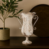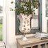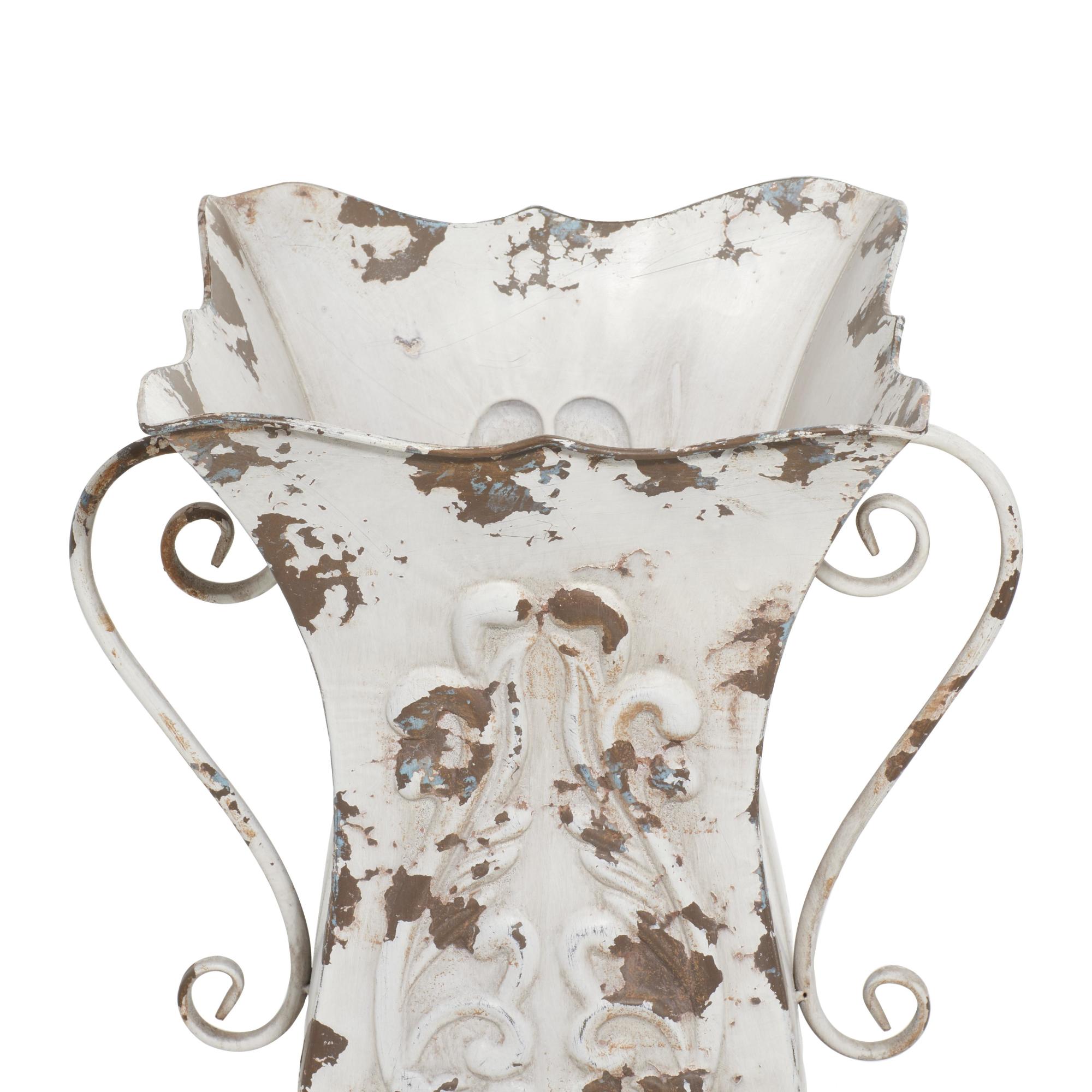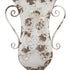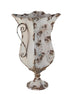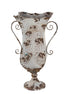 •The weathered vase for faux flowers has an amphora shape and scroll handles that complements various interior styles