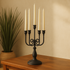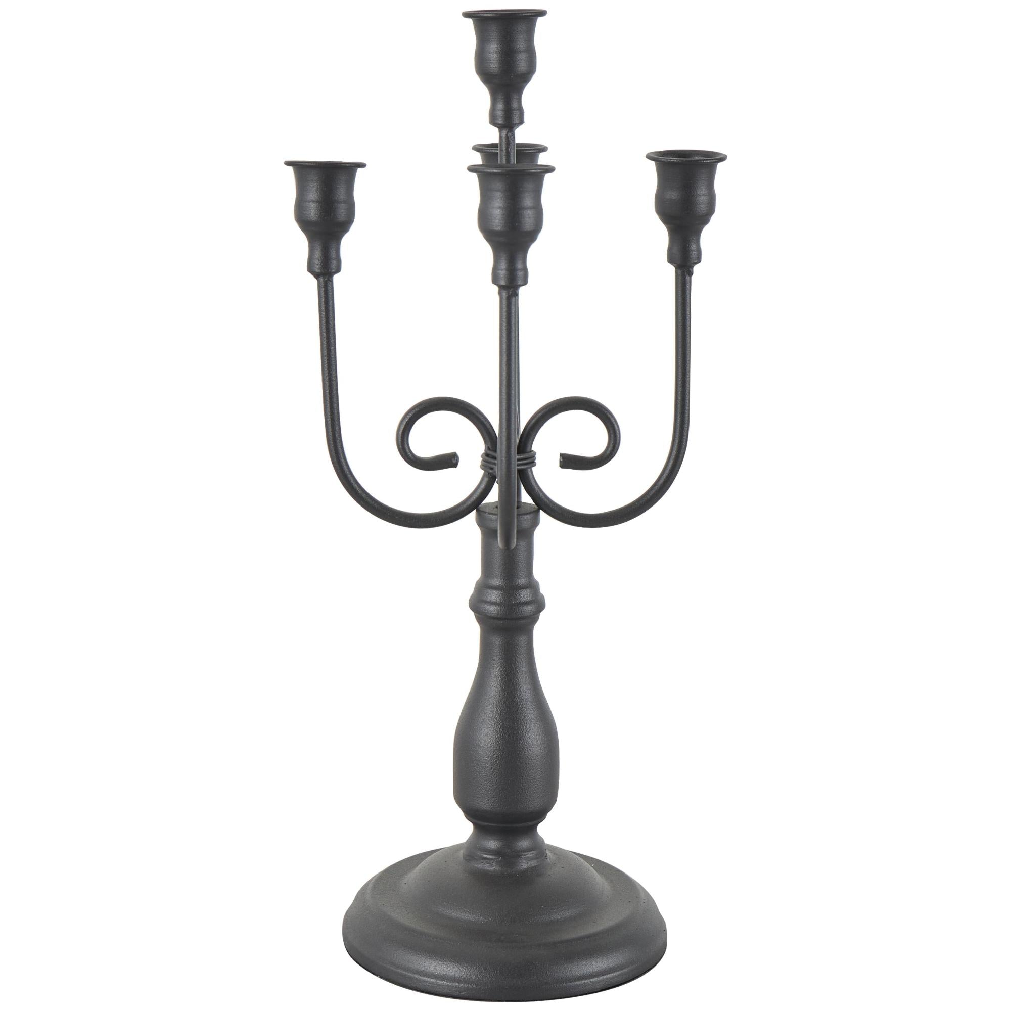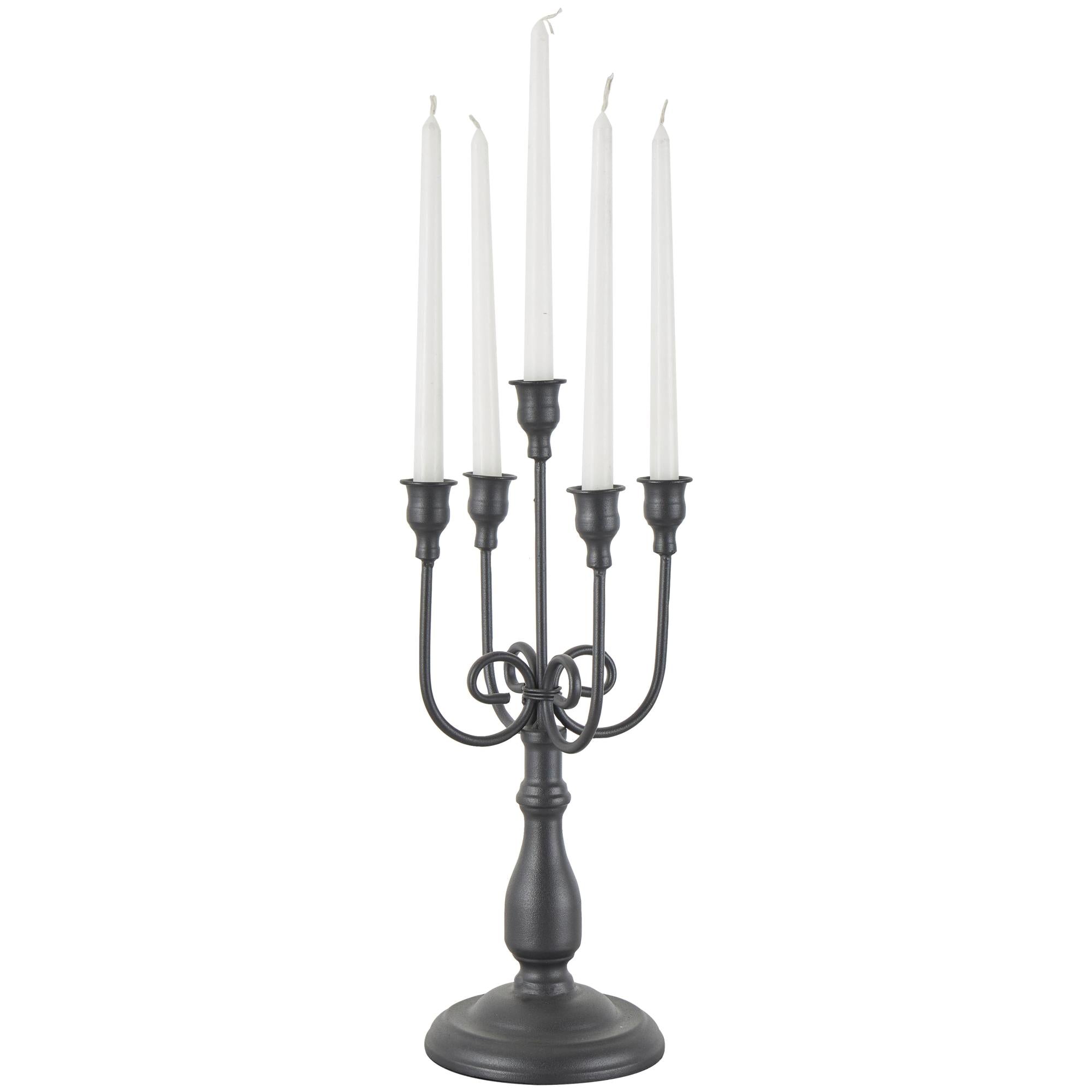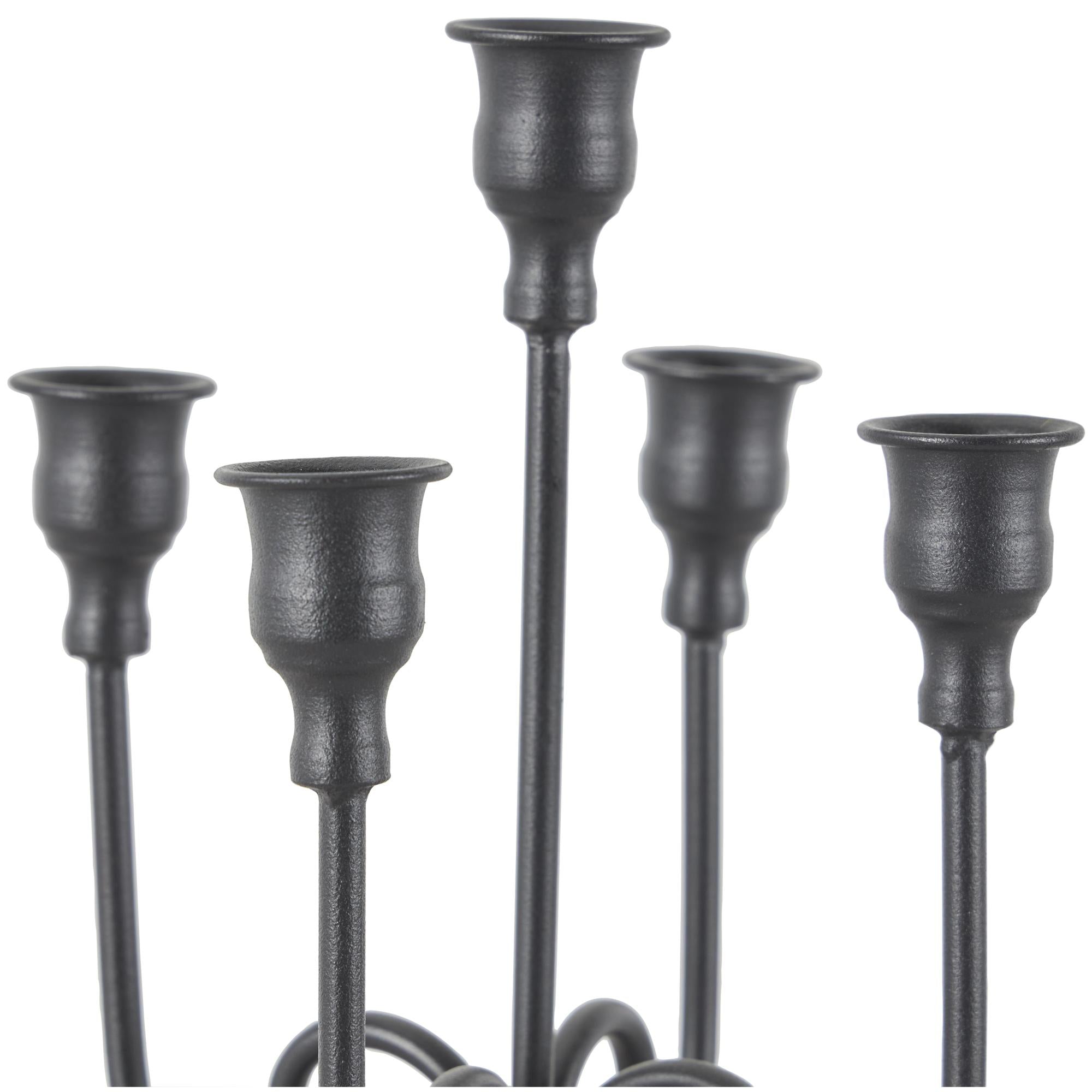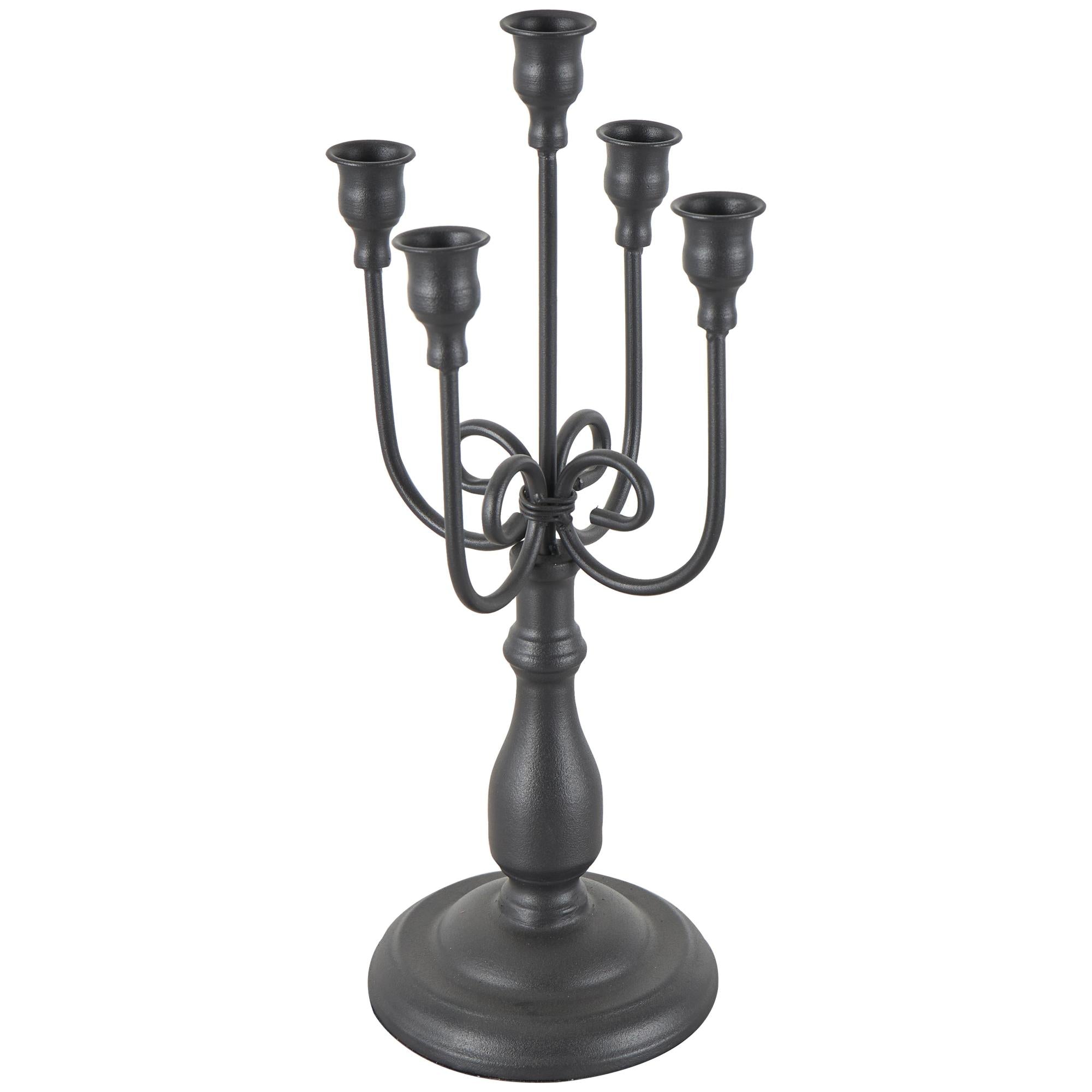 Style the candlestick holder with tall taper candles on a dining table or mantel to create a warm and inviting ambiance. Designed with felt or rubber stoppers at the base that prevent scratching furniture and table tops, as well as sliding around. Can hold 5 taper candles, not included. This item ships in 1 carton. Iron candelabra makes a great gift for any occasion. Suitable for indoor use only. This item ships fully assembled in one piece. This is a single candlestick holder. Traditional style.