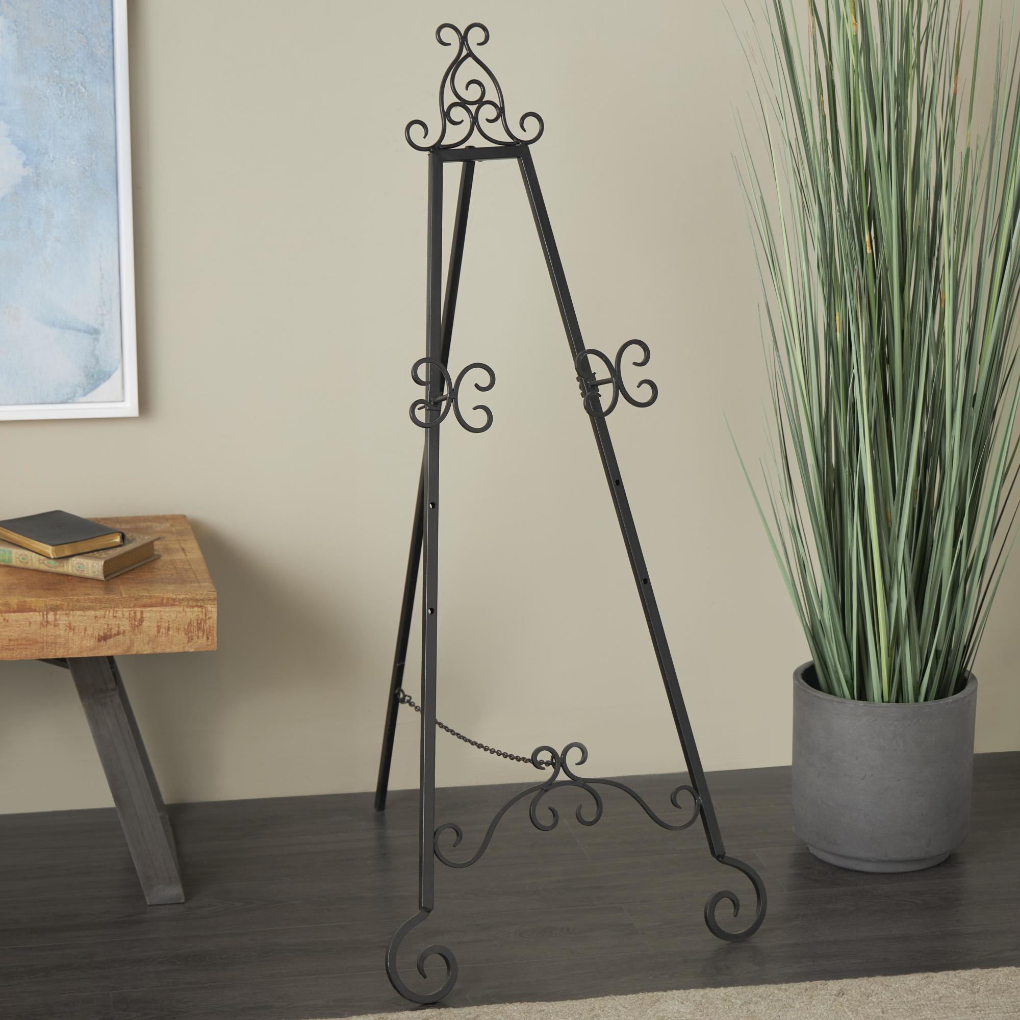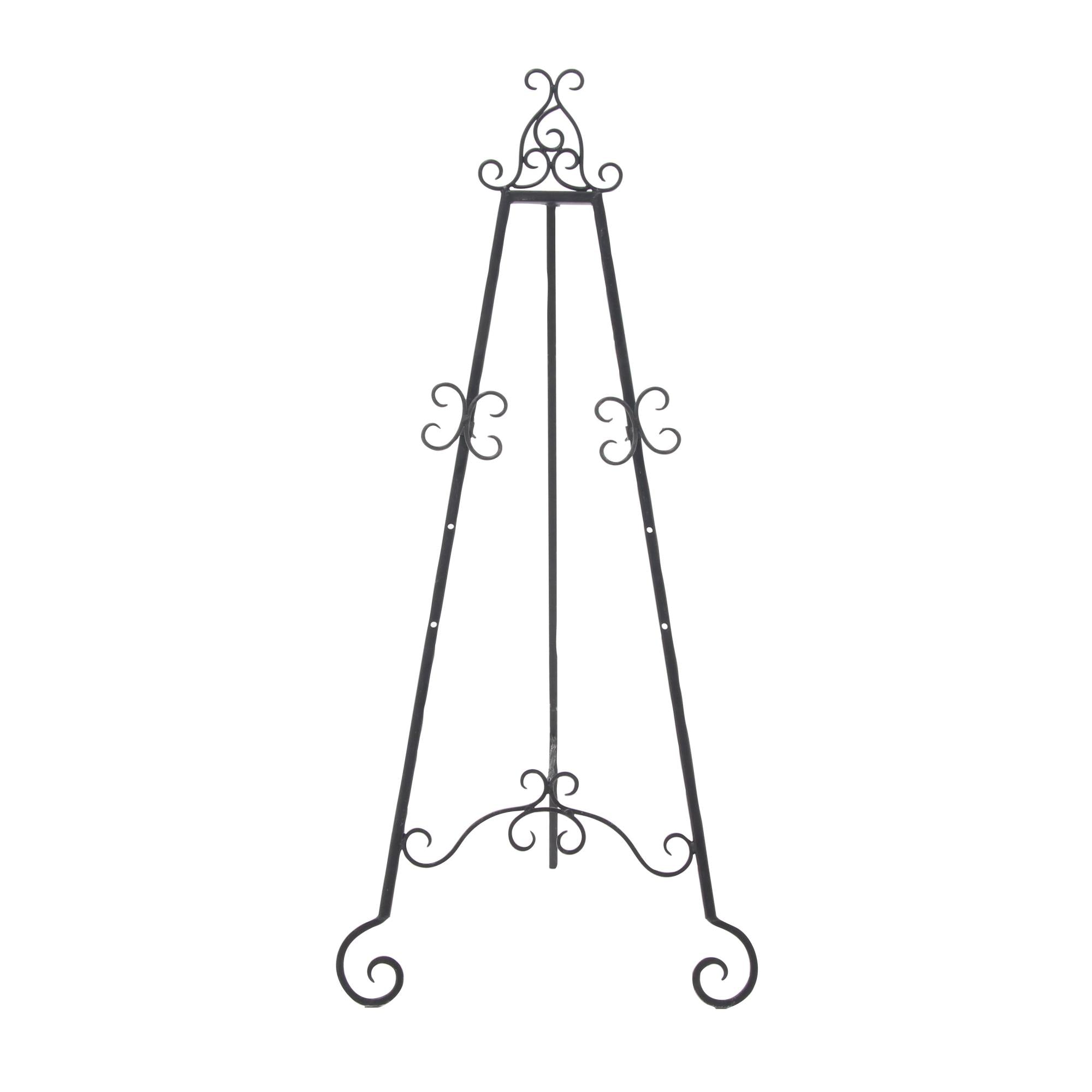 Put your show art and signs on display with this charming easel. Durable and sturdy, this easel lets you display your favorite things with ease, and with out overshadowing your piece. Place the scroll floor standing easel in your living room or entryway to elegantly display framed art pieces that captivate guests. This item ships in 1 carton. Decorative floor easel features 3 adjustable levels to suit various sized items; however, items should not exceed the height of the easel when placed on it to prevent tipping and to ensure stability. This easel is designed to accommodate items with a maximum weight limit of 10 pounds, and a maximum height of 25 inches at the lowest level and 16 inches at the highest level. Suitable for indoor use only. This item ships fully assembled in one piece. Maximum weight limit is 10 lbs. Made in India. This is a single floor standing easel. Traditional style.