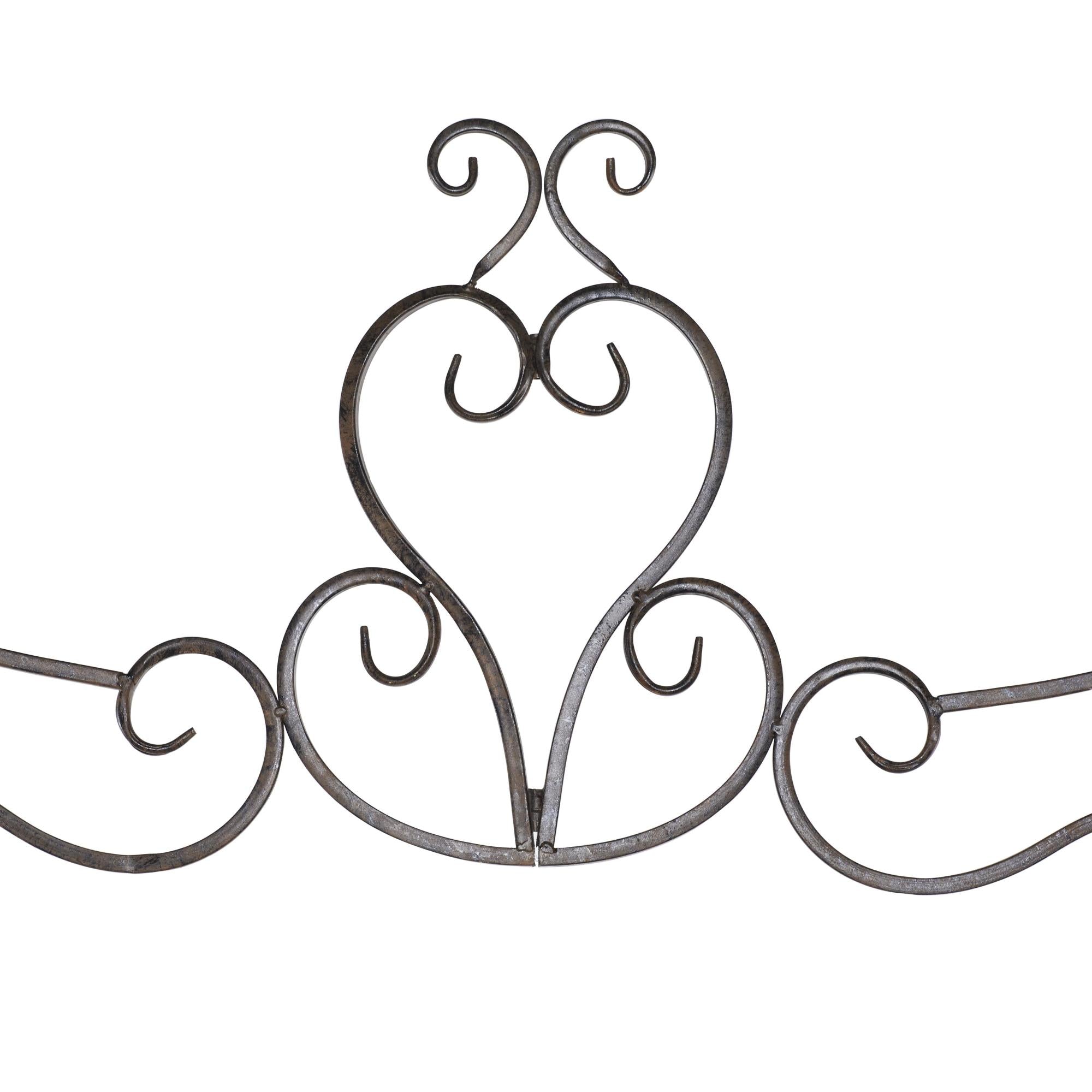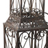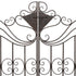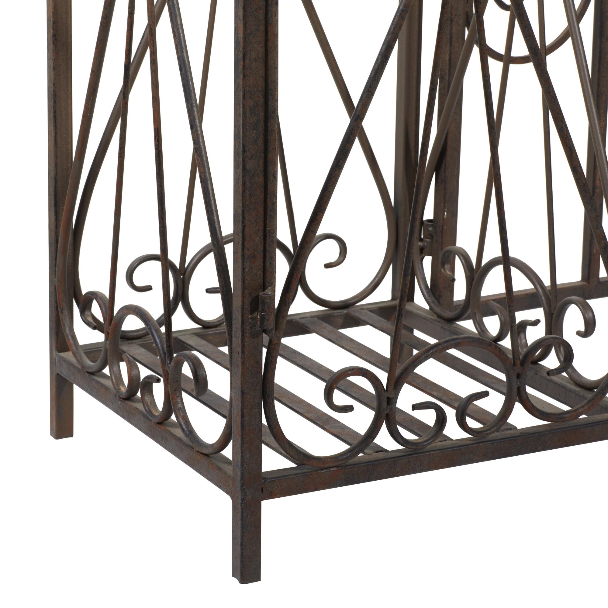 •The traditional garden arbor is constructed of iron components welded together to form intricate detailing