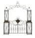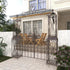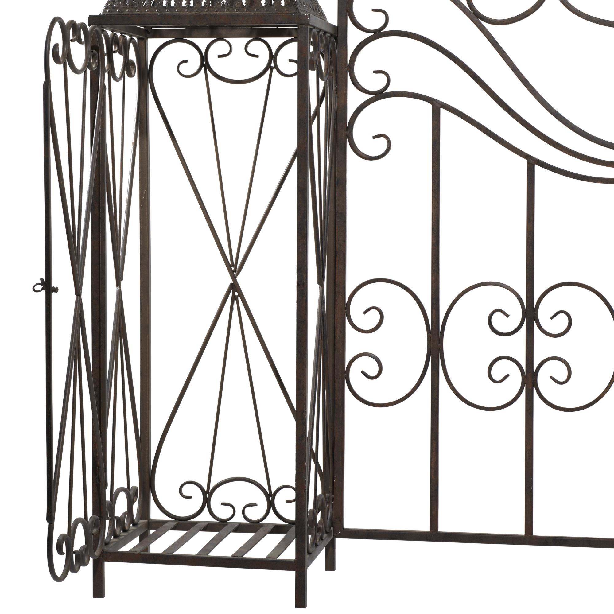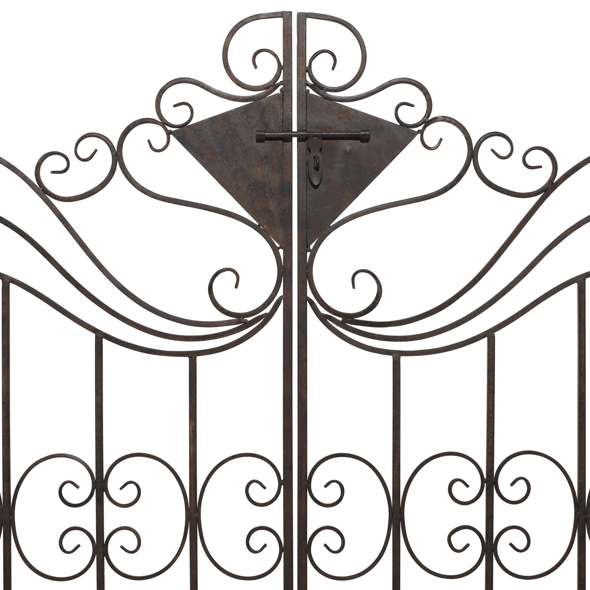 •Metal garden arbor features an elegant and sophisticated outdoor gate with double doors and latch that has a stylish vintage scrollwork