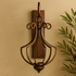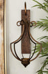•The weathered decorative wall sconce features a rectangular wall mount with a chandelier-style metal holder with scroll patterns and a round candle plate
