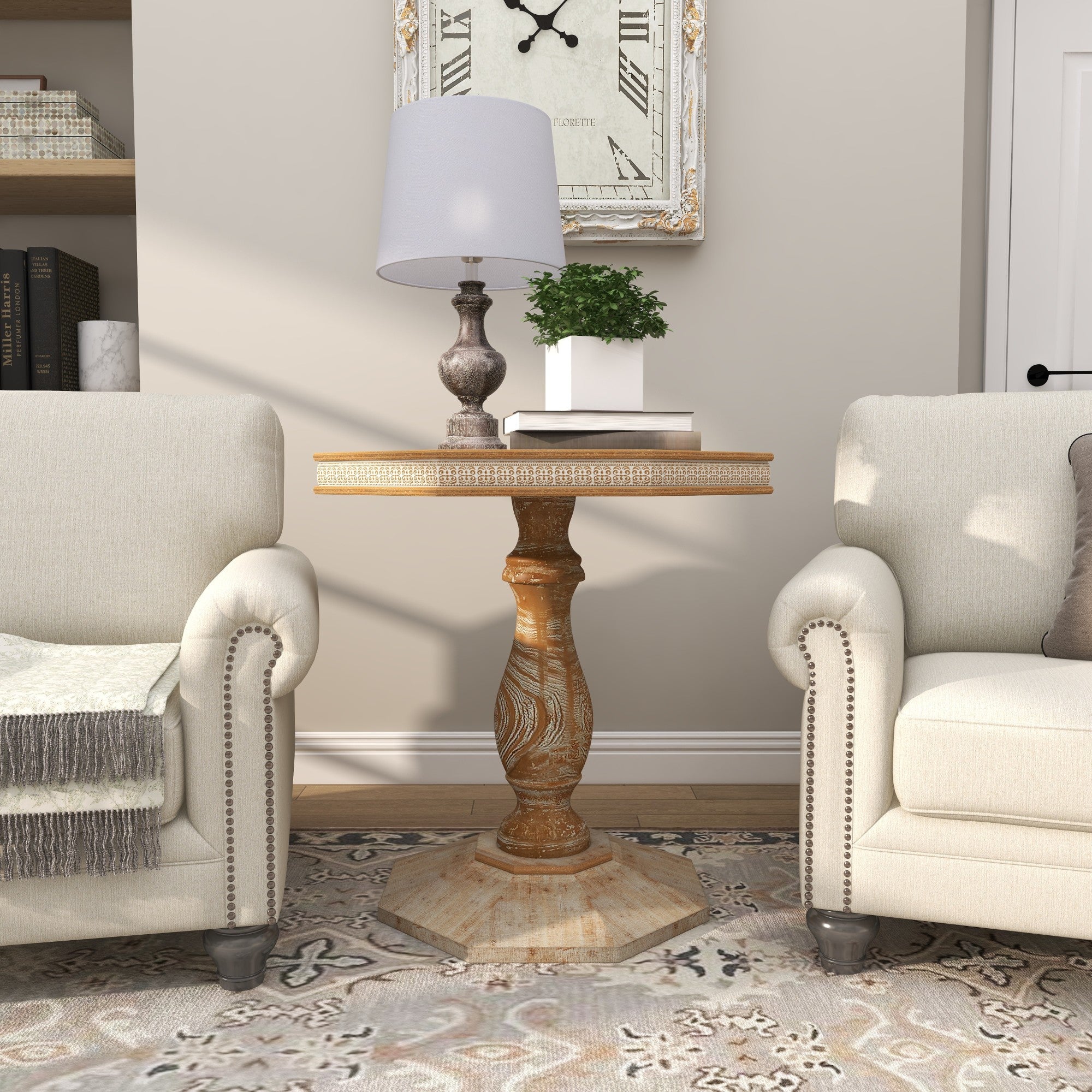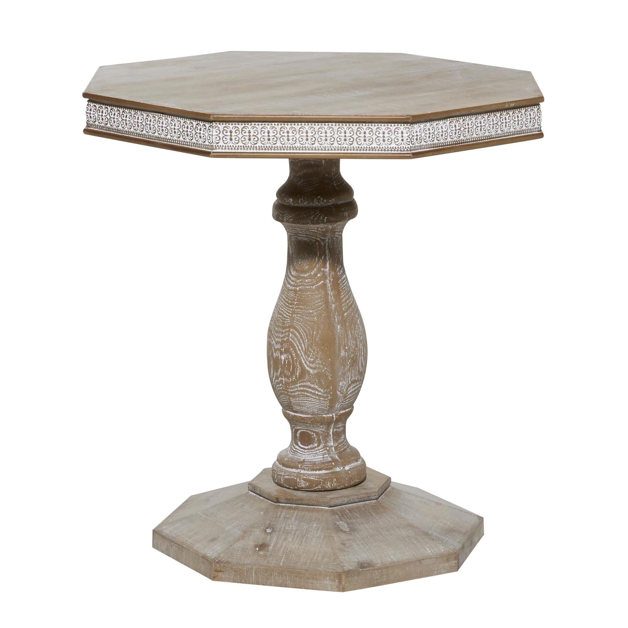 •Washed living room table stands out with its hexagonal surface and base design, further embellished by traditional patterns on the side for a distinctive look