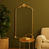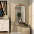 •A floor mirror that boasts a striking arched shape, beautifully complemented by an ornate pattern that dances across its surface, exuding an elegant charm that effortlessly elevates any space