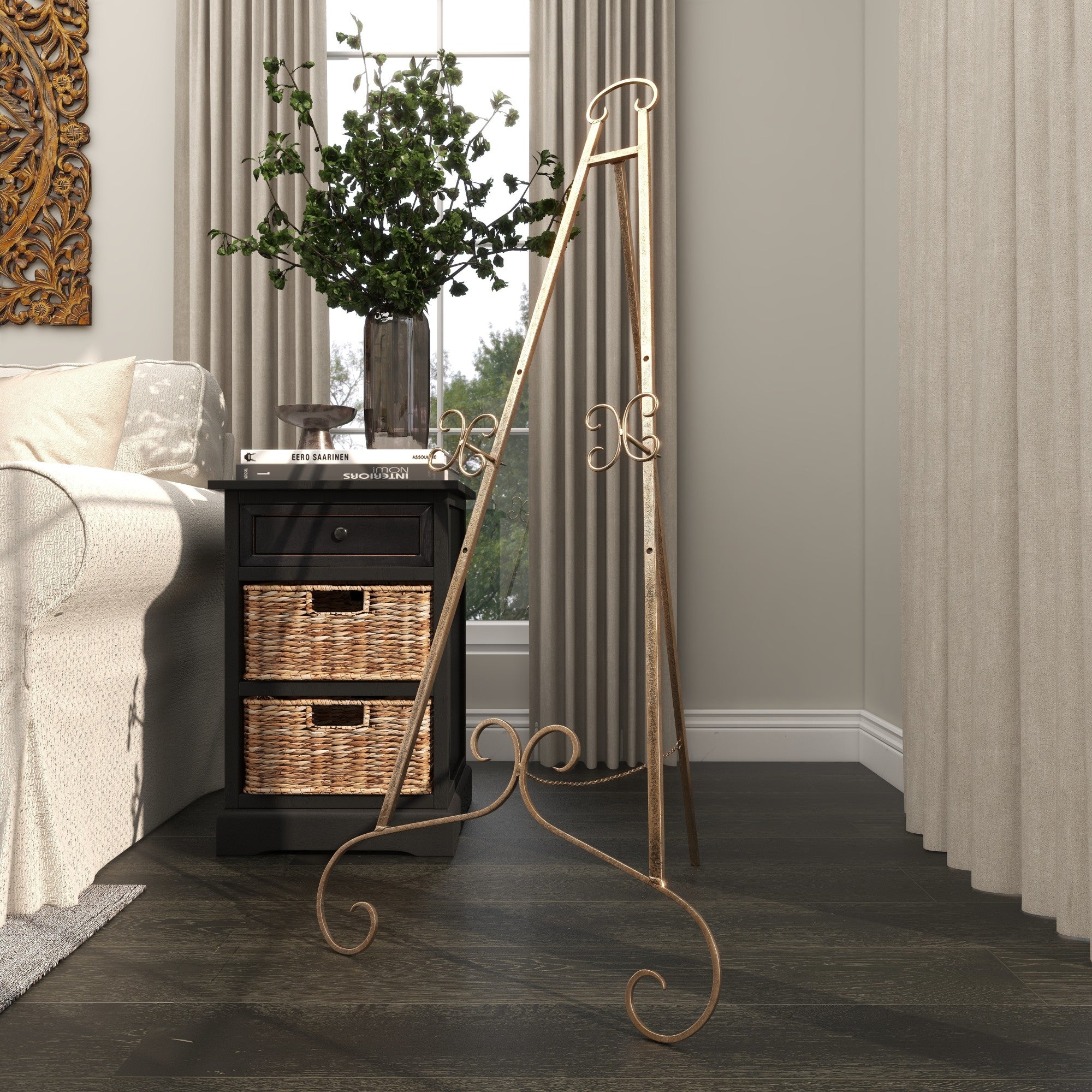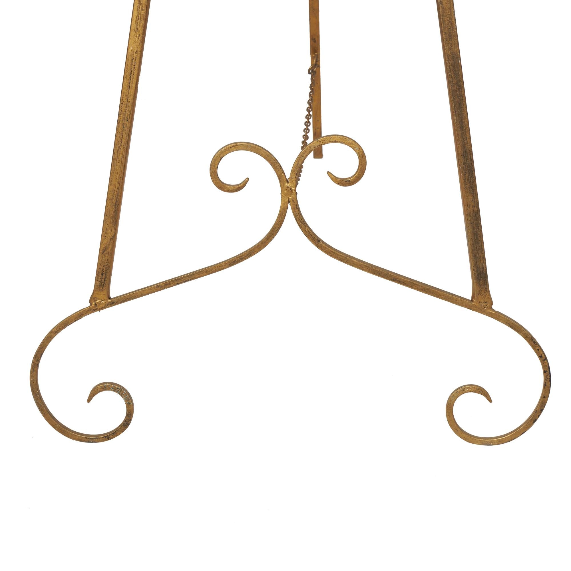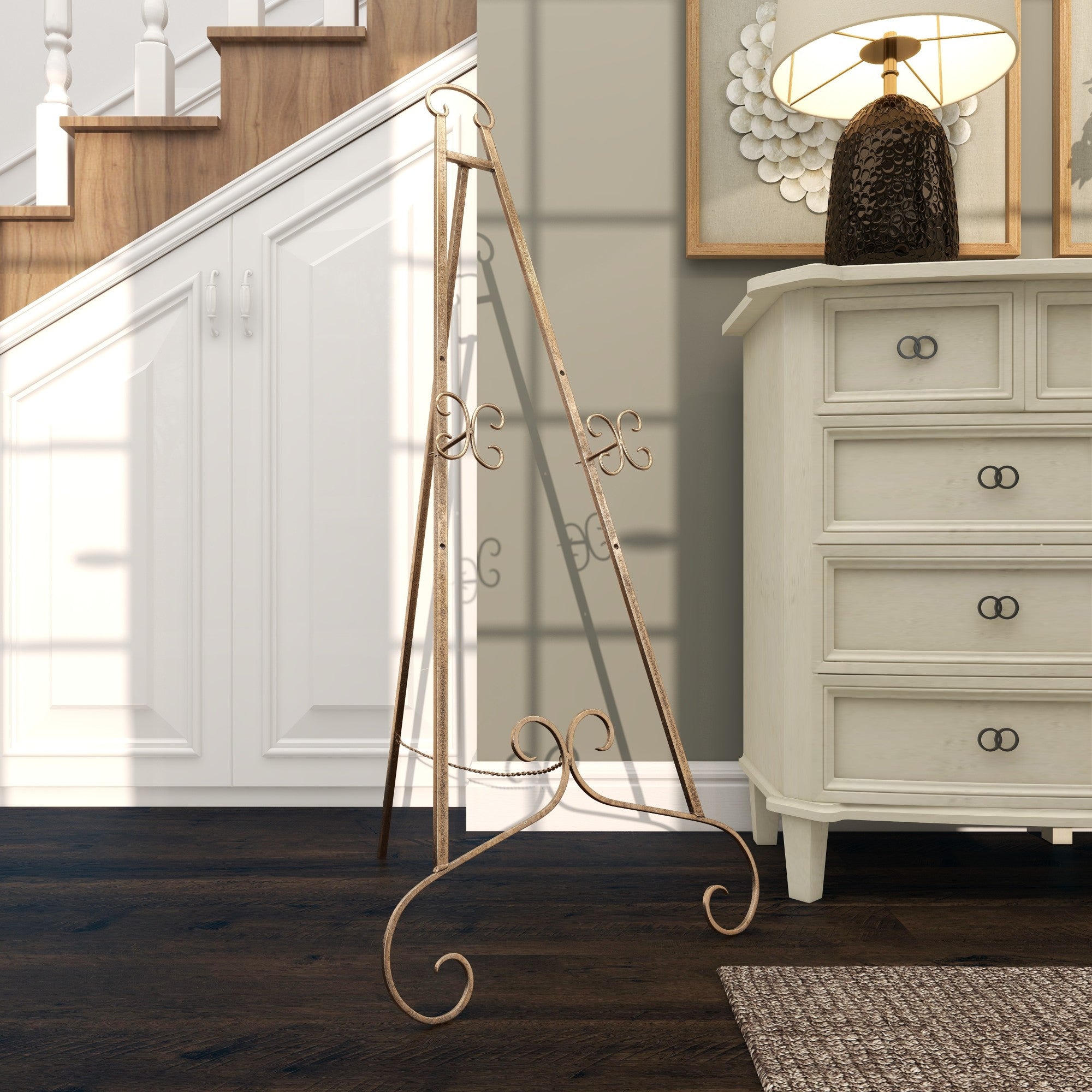 Put your show art and signs on display with this charming easel. Durable and sturdy, this easel lets you display your favorite things with ease, and with out overshadowing your piece. Place the scroll floor standing easel in your living room or entryway to elegantly display framed art pieces that captivate guests. This item ships in 1 carton. Decorative floor easel features 3 adjustable levels to suit various sized items; however, items should not exceed the height of the easel when placed on it to prevent tipping and to ensure stability. This easel is designed to accommodate items with a maximum weight limit of 10 pounds, and a maximum height of 25 inches at the lowest level and 16 inches at the highest level. Suitable for indoor use only. This item ships fully assembled in one piece. Maximum weight limit is 10 lbs. Made in India. This is a single floor standing easel. Traditional style.