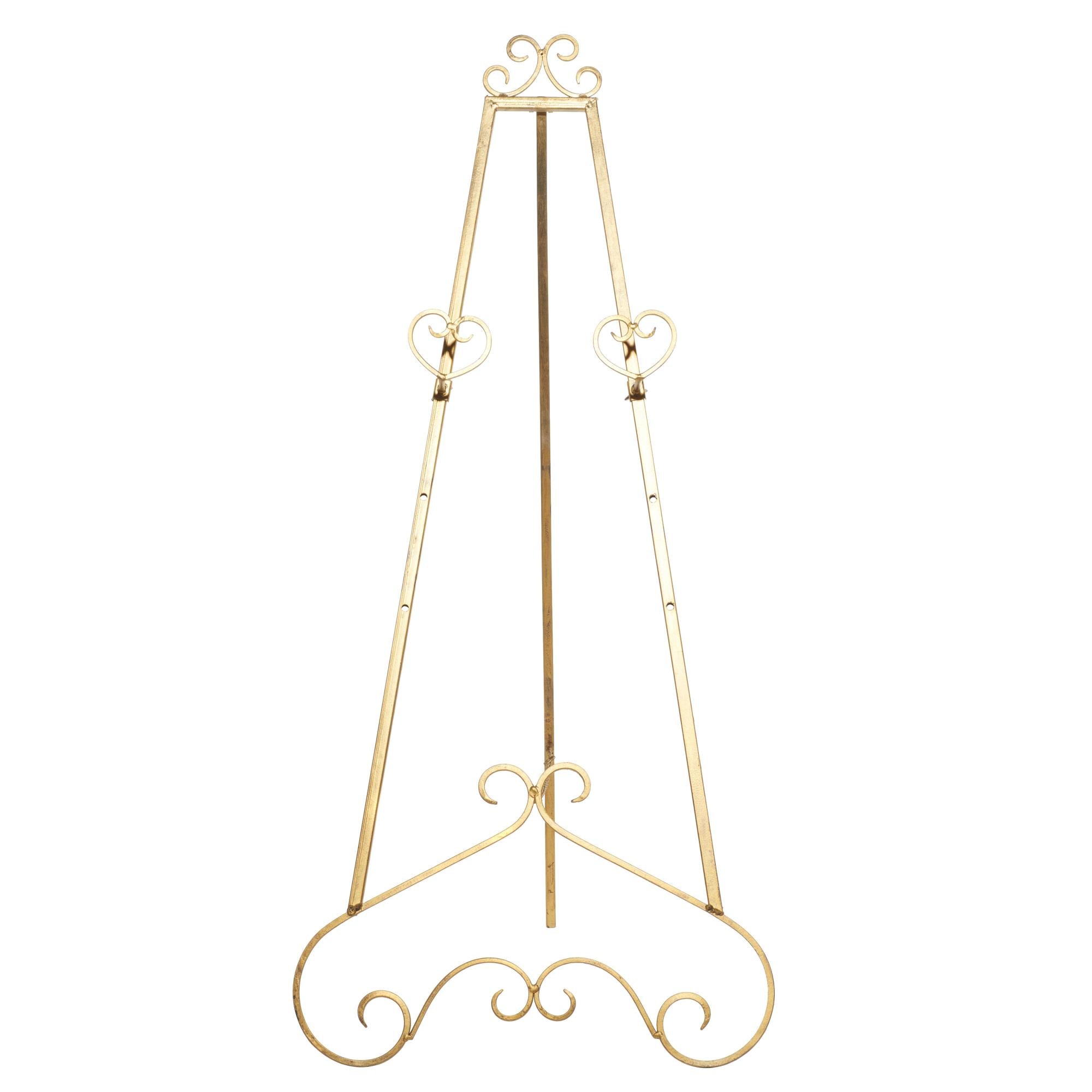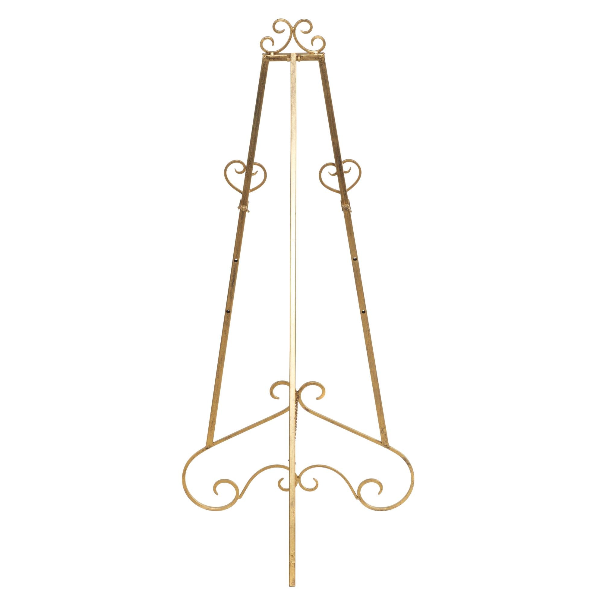 •This iron easel boasts a traditional design with elegant scrollwork details and three adjustable tiers for versatile display options