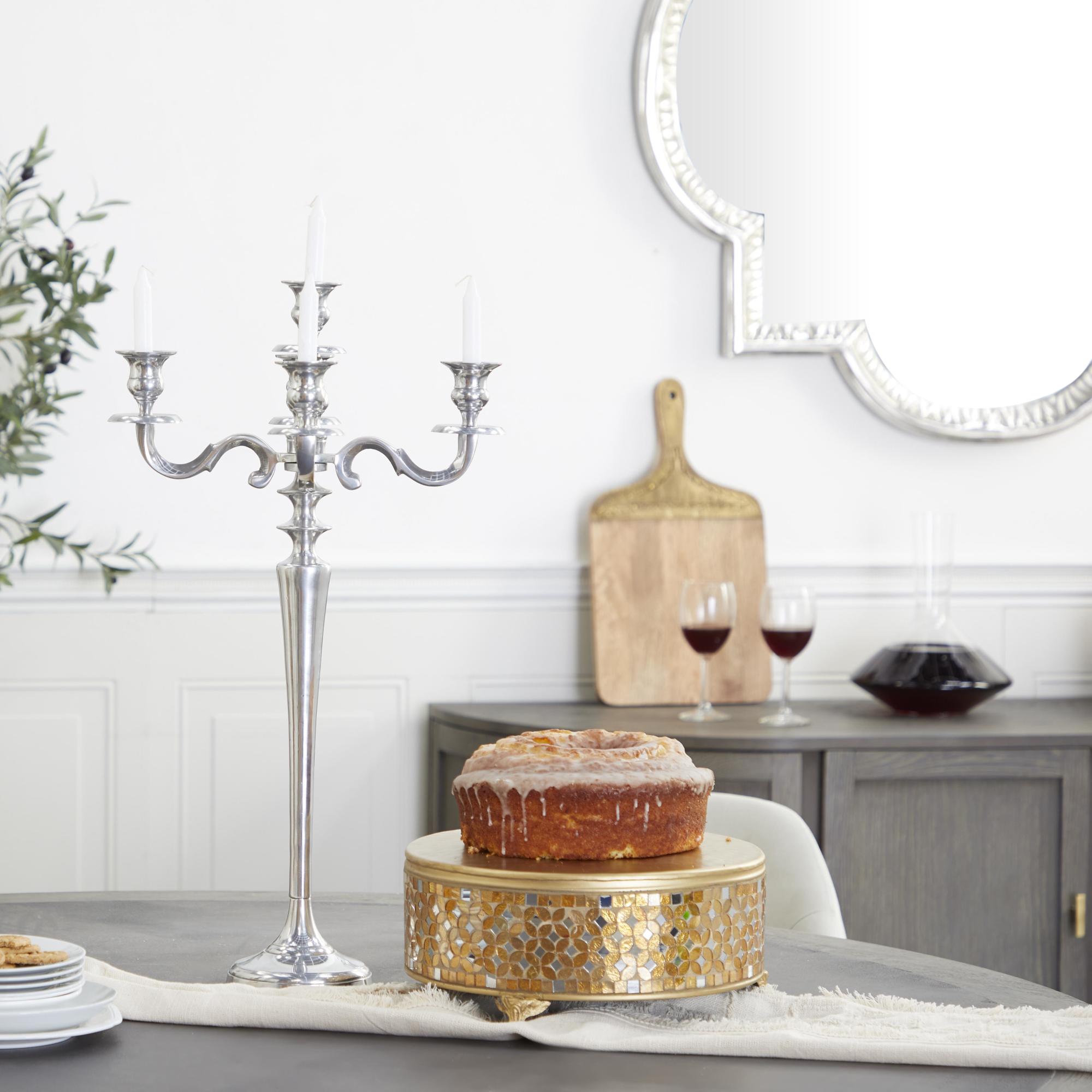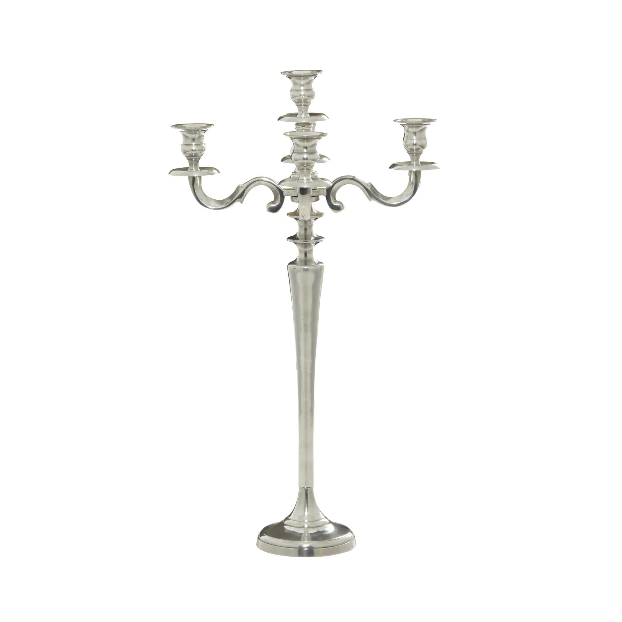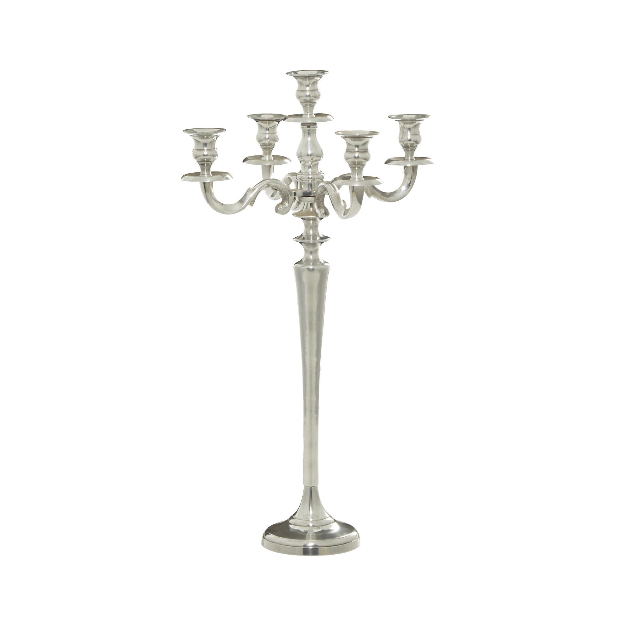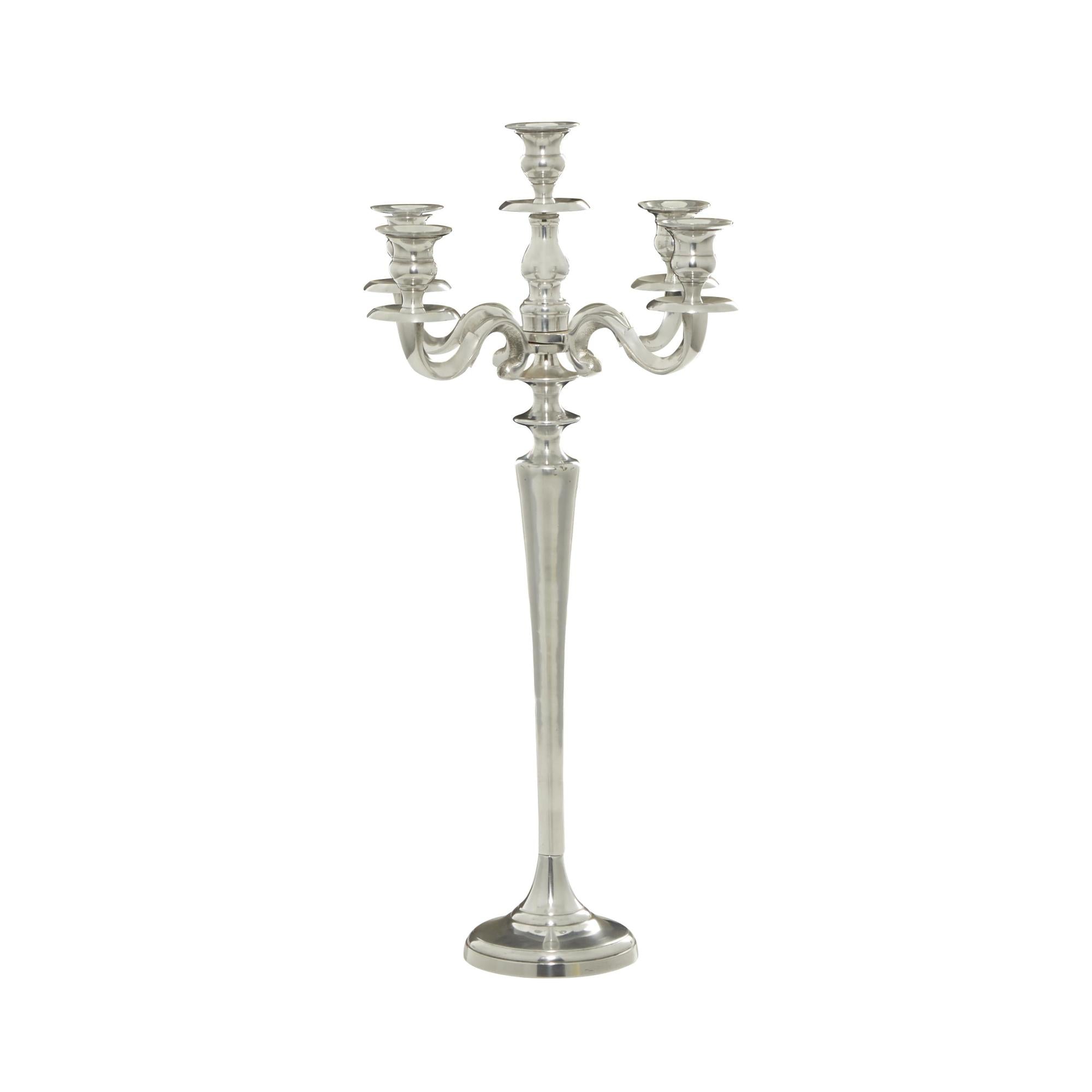 It is a great addition to your home decoration and will surely complement your existing furniture. Made with a sturdy base, it is perfect for creating an elegant atmosphere at your table top or mantel. Style the scroll candlestick holder as a dinner table centerpiece or on a console table for ambient lighting, pairing it with tall, tapered candles for added grandeur. Designed with felt or rubber stoppers at the base that prevent scratching furniture and table tops, as well as sliding around. Can hold 5 taper candles, not included. This item ships in 1 carton. Aluminum candelabra makes a great gift for any occasion. Suitable for indoor use only. Some assembly required. Made in India. This is a single candlestick holder. Traditional style.