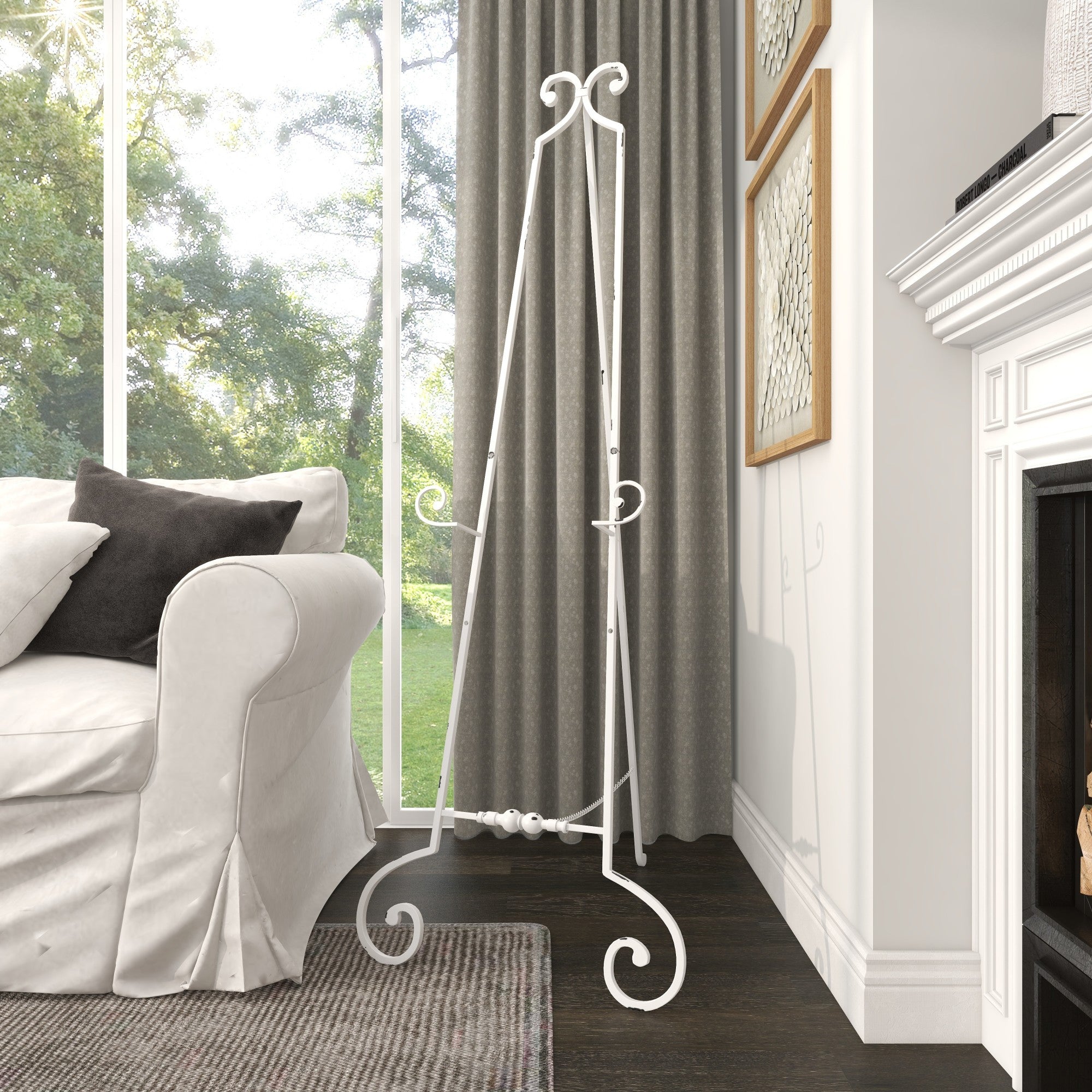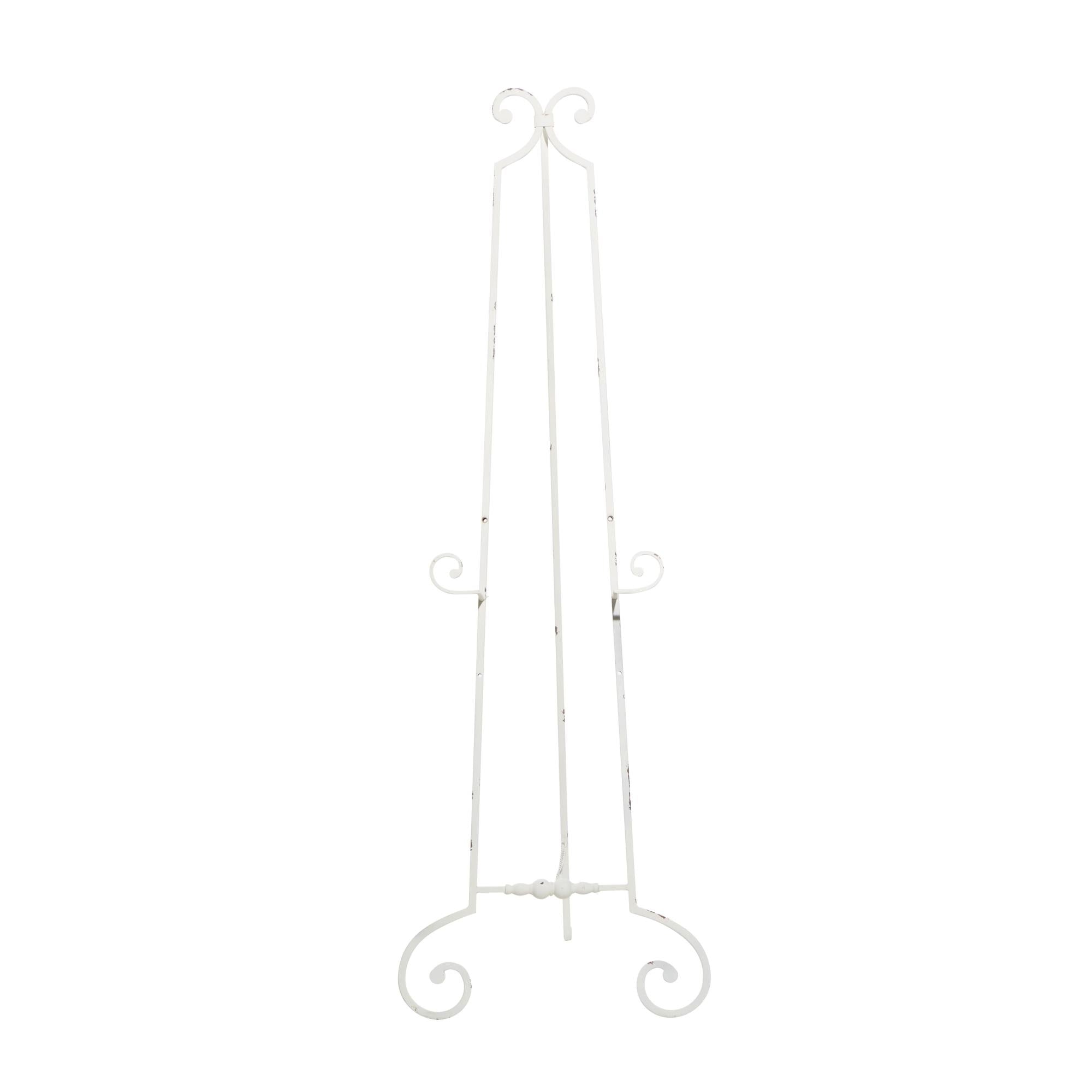 Put your show art and signs on display with this charming easel. Durable and sturdy, this easel lets you display your favorite things with ease, and with out overshadowing your piece. Place the scroll floor standing easel in your living room or entryway to elegantly display framed art pieces that captivate guests. This item ships in 1 carton. Decorative floor easel features 3 adjustable levels to suit various sized items; however, items should not exceed the height of the easel when placed on it to prevent tipping and to ensure stability. This easel is designed to accommodate items with a maximum weight limit of 10 pounds, and a maximum height of 30 inches at the lowest level and between 16- 25 inches at the highest level. Suitable for indoor use only. This item ships fully assembled in one piece. Maximum weight limit is 10 lbs. This is a single floor standing easel. Country Cottage style.