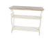 •The modern home console table features a carved wooden base with two shelves, painted with and furnished with a natural wooden tabletop