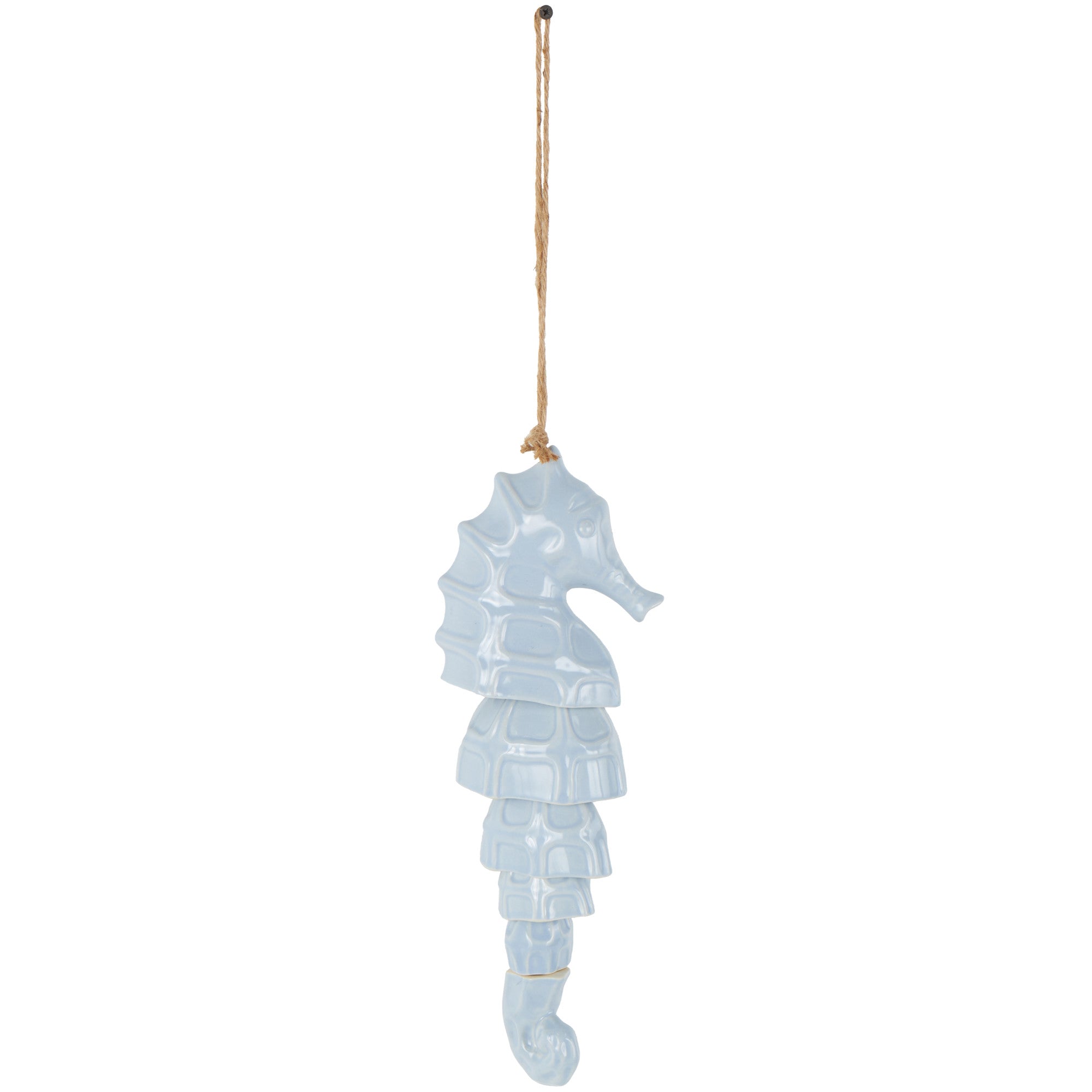 •The ceramic windchime showcases a sea horse form and includes a rope for hanging, adding a coastal touch to any setting