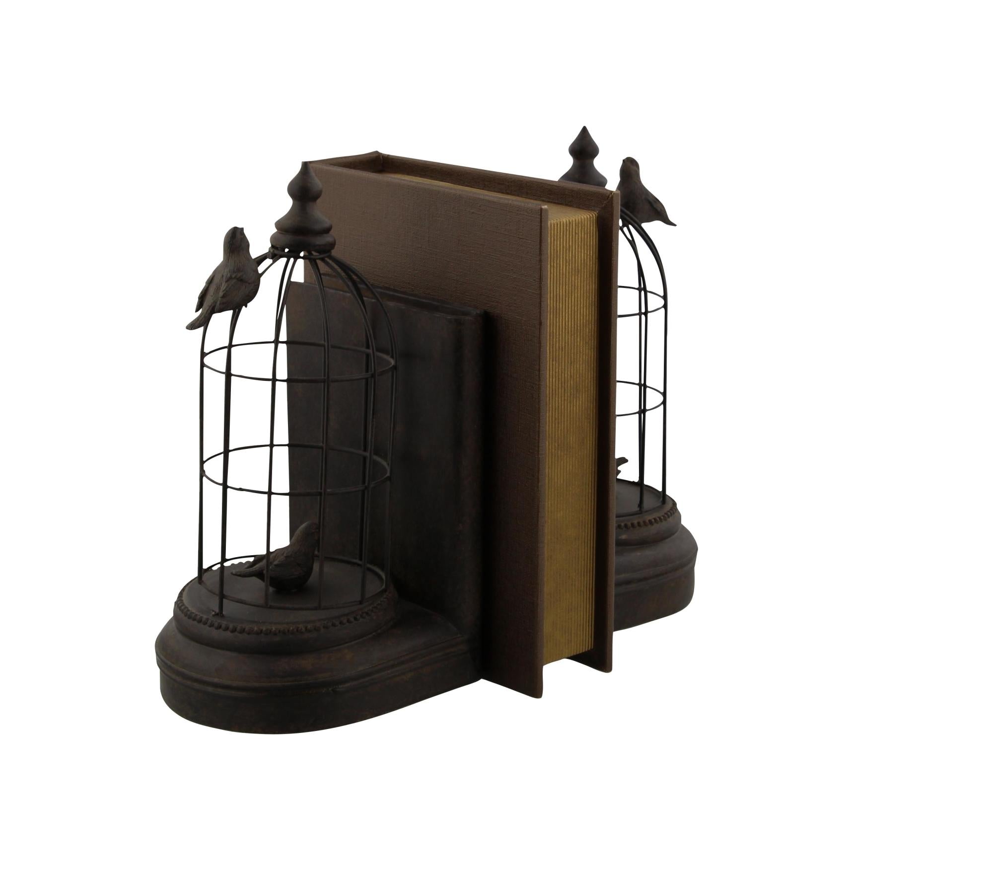 •Metal set of 2 bookends showcases birds on and inside farmhouse-style cages, standing books, and round bases that make it stand out