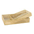 •The textured storage tray features a rectangular shape with round open weave patterns on the sides that enhance its natural appeal
