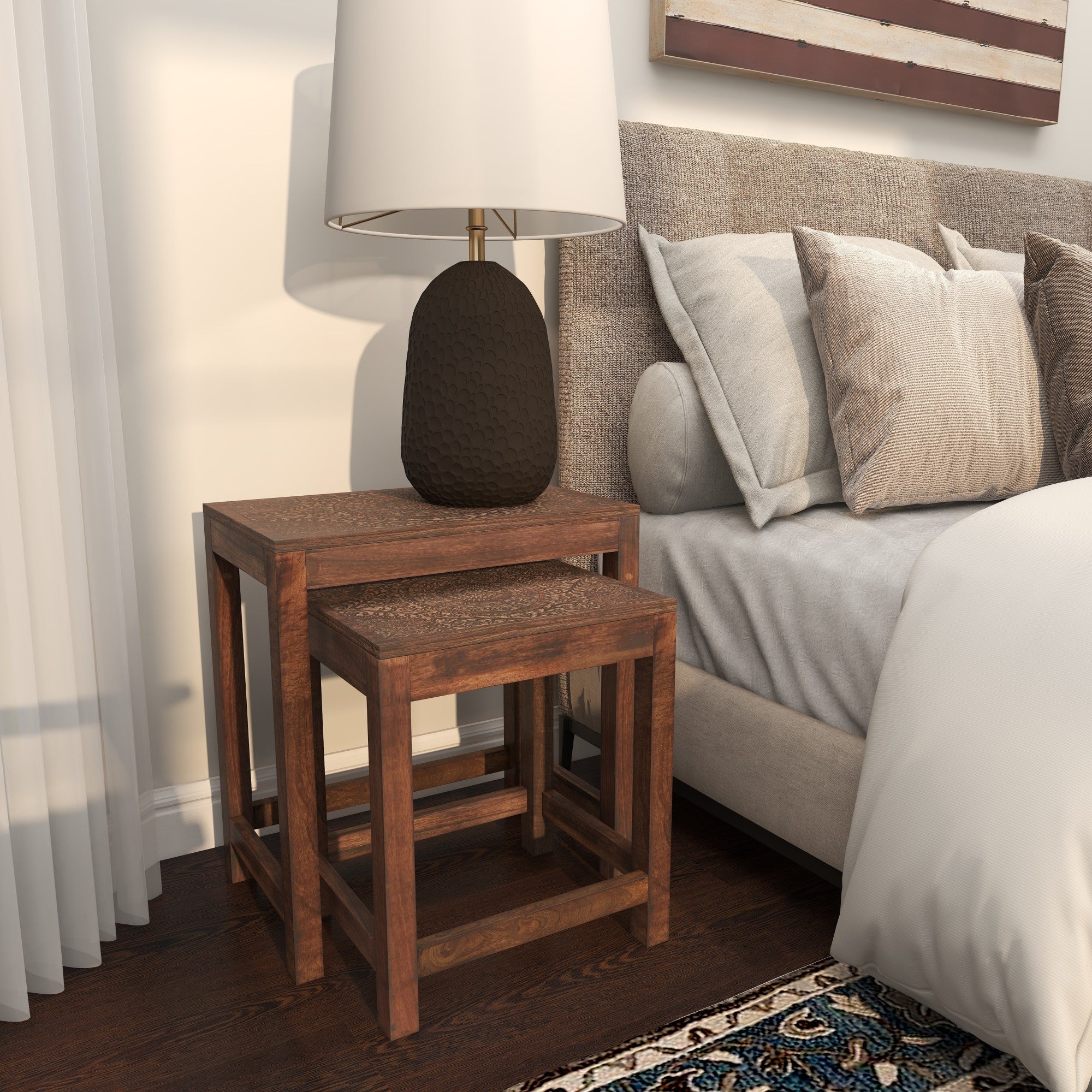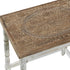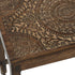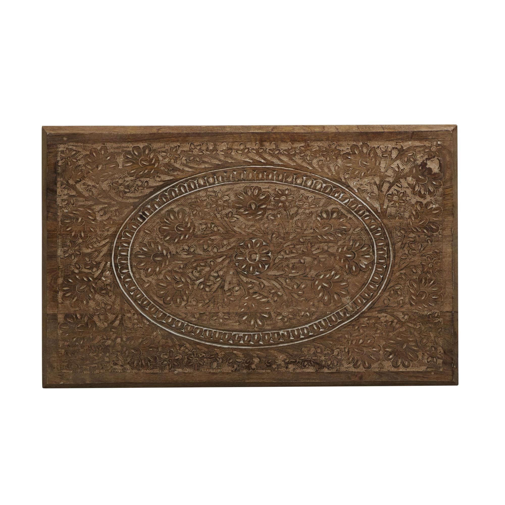 •The mango wood set of 2 accent tables showcases intricately carved mandala and botanical designs on their tops, differing in size to offer a nesting component for optimal storage