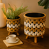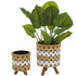 •The jute set of 2 plant pots stands out with an intricate chevron pattern, complemented by the included metal pots and wooden legs which add depth and contrast to their design