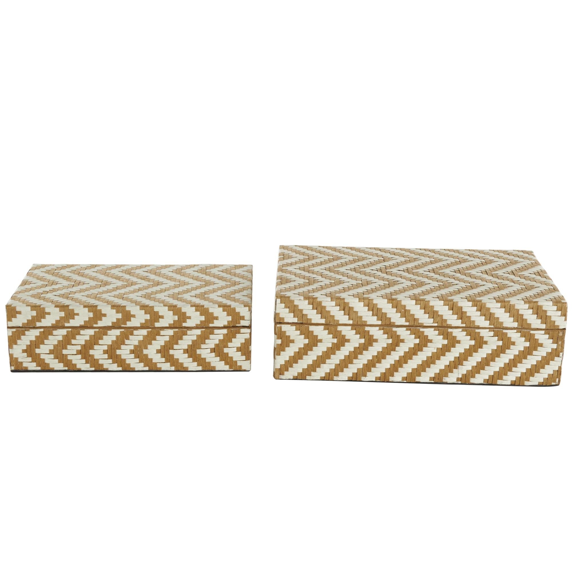 Set of 2 Geometric Brown Paper Handmade Woven Zig Zag Storage Decorative Box with Cream Accents