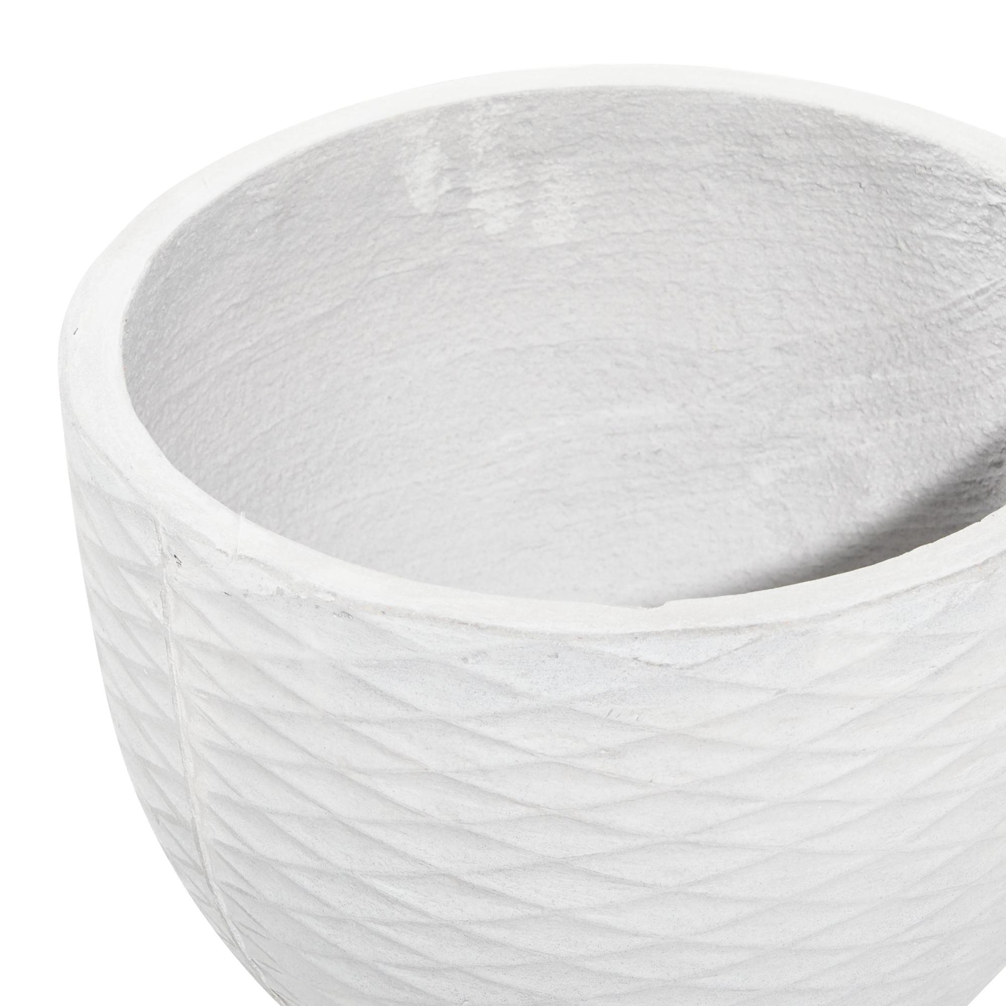 •Matte flower pot for outdoor plants features a tapered round planter shaped with tripod splayed legs and a diamond pattern